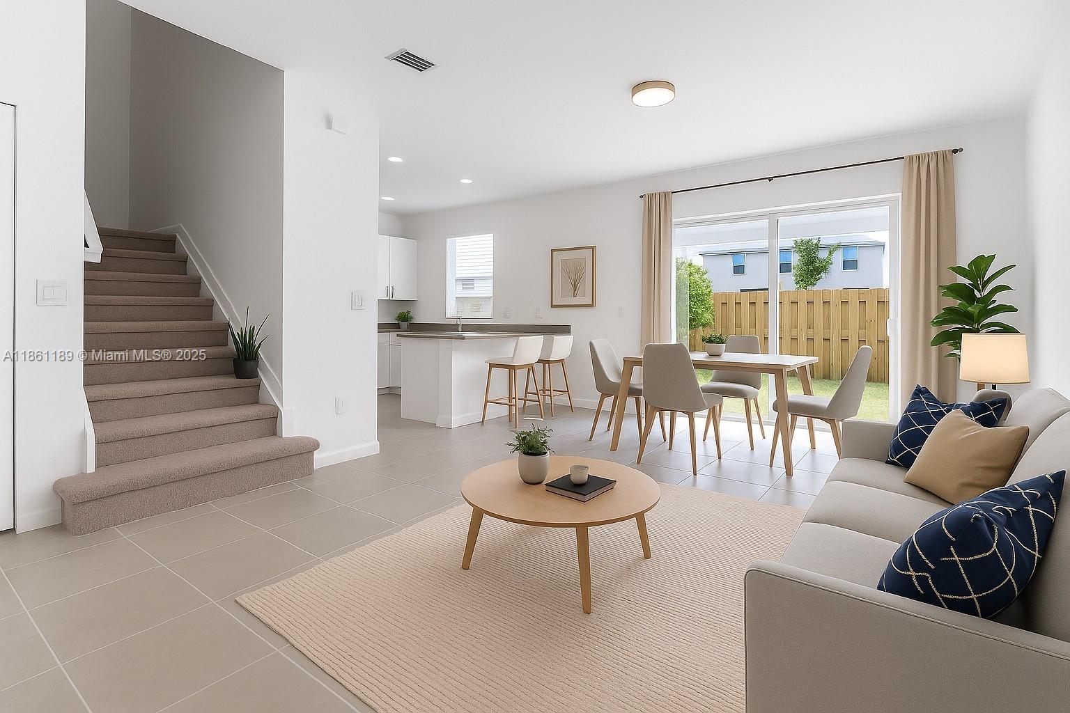 Brand-new two-story townhouse offers three spacious bedrooms, two full bathrooms, and one half-bath. The open layout features a family room/dining room, and kitchen, complemented by a separate living room for additional relaxation and entertainment space. All bedrooms are on the second floor. Kitchen boasts stainless steel appliances, quartz countertops, and ample cabinet space. Elegant ceramic tile flooring on the main level, the second floor is carpeted for added comfort. A large, fenced patio provides the perfect setting for relaxation or entertaining. Conveniently situated near schools, Turnpike Exit 2, retail shops, restaurants, a hospital, Amazon Distribution Center, and Homestead Air Base. Association approval requires 30 days, and tenants are responsible for water and electricity.