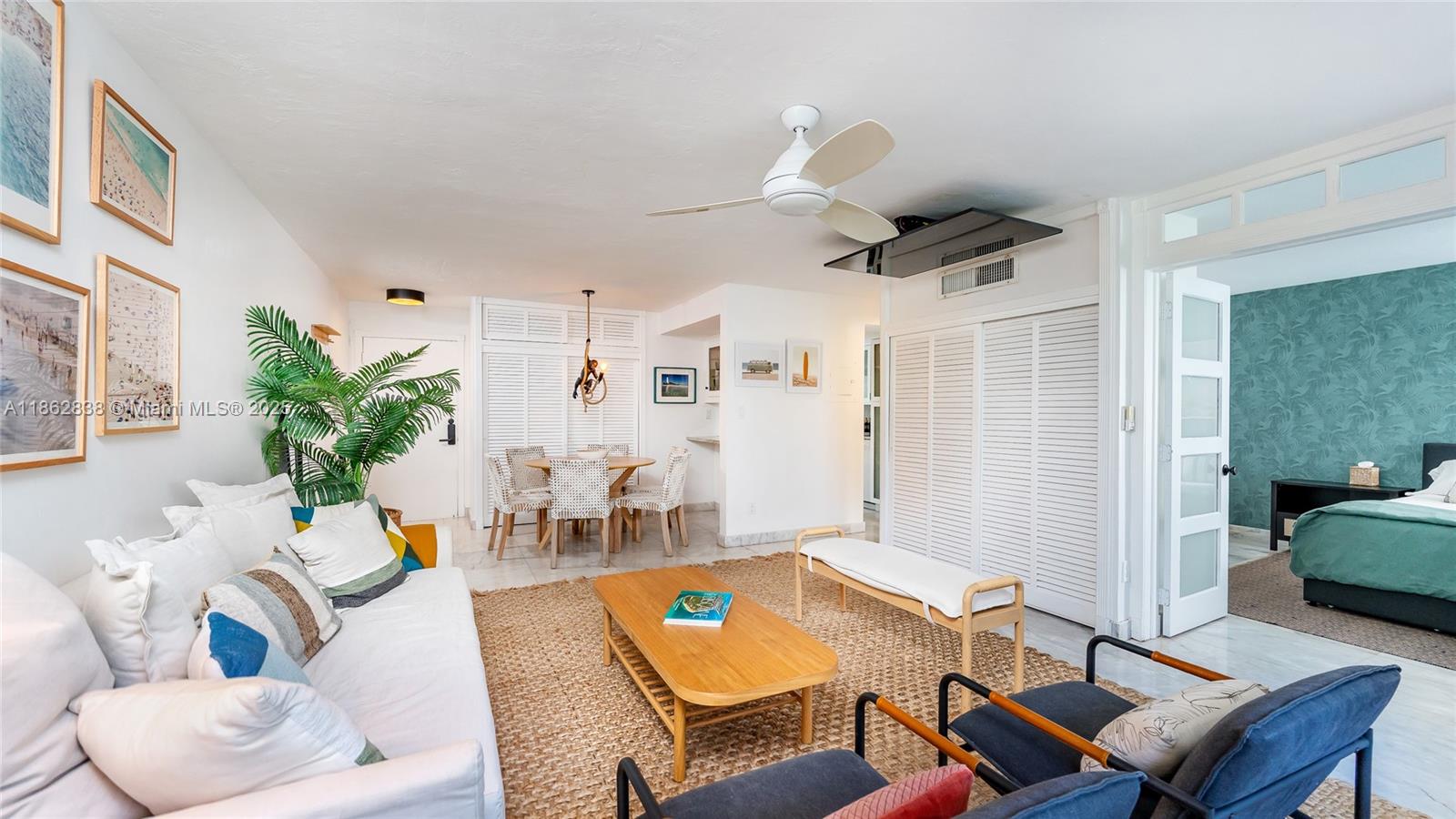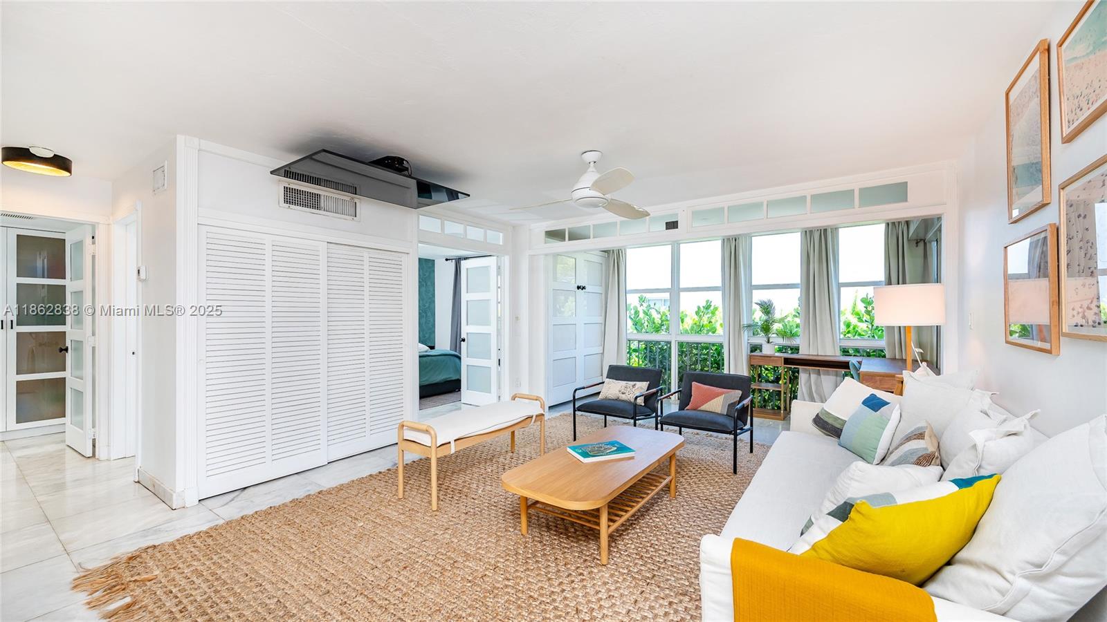 Stylish and inviting corner lanai in a quiet 10-unit boutique building, perfectly located in the heart of Key Biscayne. This fully furnished residence combines contemporary finishes with a warm, homey feel, featuring white marble floors, Brazilian quartz countertops, and custom cabinetry. Large windows flood the space with natural light, while the den with a queen Murphy bed offers the flexibility of a second bedroom. Street-level entry gives it the comfort and privacy of a home. Enjoy FOB beach access just a 5-minute walk away, plus a pool, assigned parking, and free laundry. Smart lock with camera for fingerprint, code, key fob, or app entry. Pet friendly. Available for short-term stays of 3 months or more.