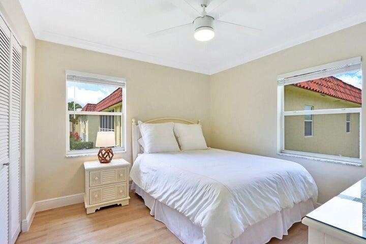 Annual Furnished Rental - $3,500! Perfectly Furnished 3 bedroom, 2 bath, 2nd fl condo available for annual lease. Renovated kitchen for open floor plan, stainless steel appliances, granite counters, vinyl flooring throughout with both bathrooms upgraded as well. Access to screened lanai from Main Bedroom and Living room to enjoy the garden view. Main bedroom has a king bed, 2nd bedroom has a queen and 3rd bedroom has 2 twins. Villas on the Green has a heated pool, tennis courts and private entrance to Carlin Park and the heart trail. You just need to bring your suit and flip flops so you can walk to the beach.