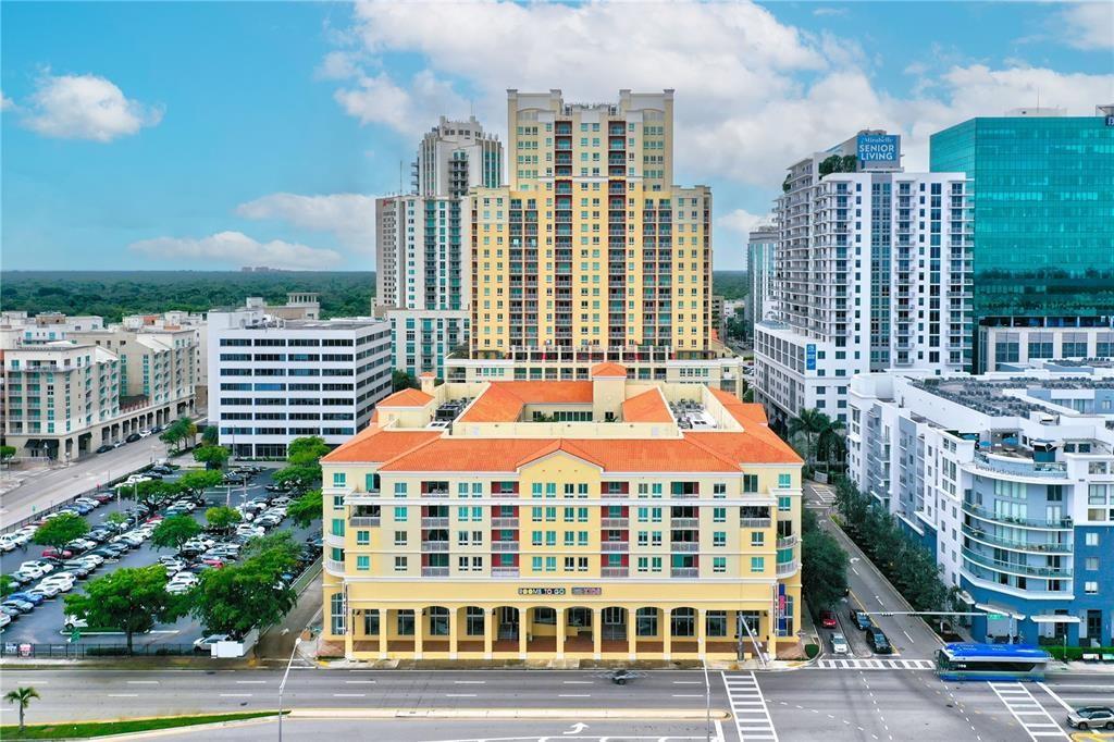 ONE OF A KIND! Oversized corer layout 1006 sqft + 95 sqft balcony! Modern wood /laminate flooring, granite countertops, washer/dryer in unit and a big walk-in closet. Extra-large balcony with a bright and open southeast view. Building offers front desk reception with 24-hour concierge services and valet parking. Beautiful pool and barbeque area, social rooms and state of the art fitness center with lockers and saunas. Cable, internet, water, sewer, trash and 1 assigned parking included. Enjoy an incredible location with easy access anywhere... right downstairs you have restaurants and coffee shops, easily walk to Publix, Trader Joes, 4 banks and even a metro rail stop 2 blocks away!
