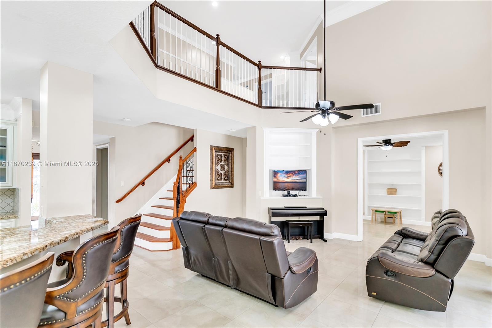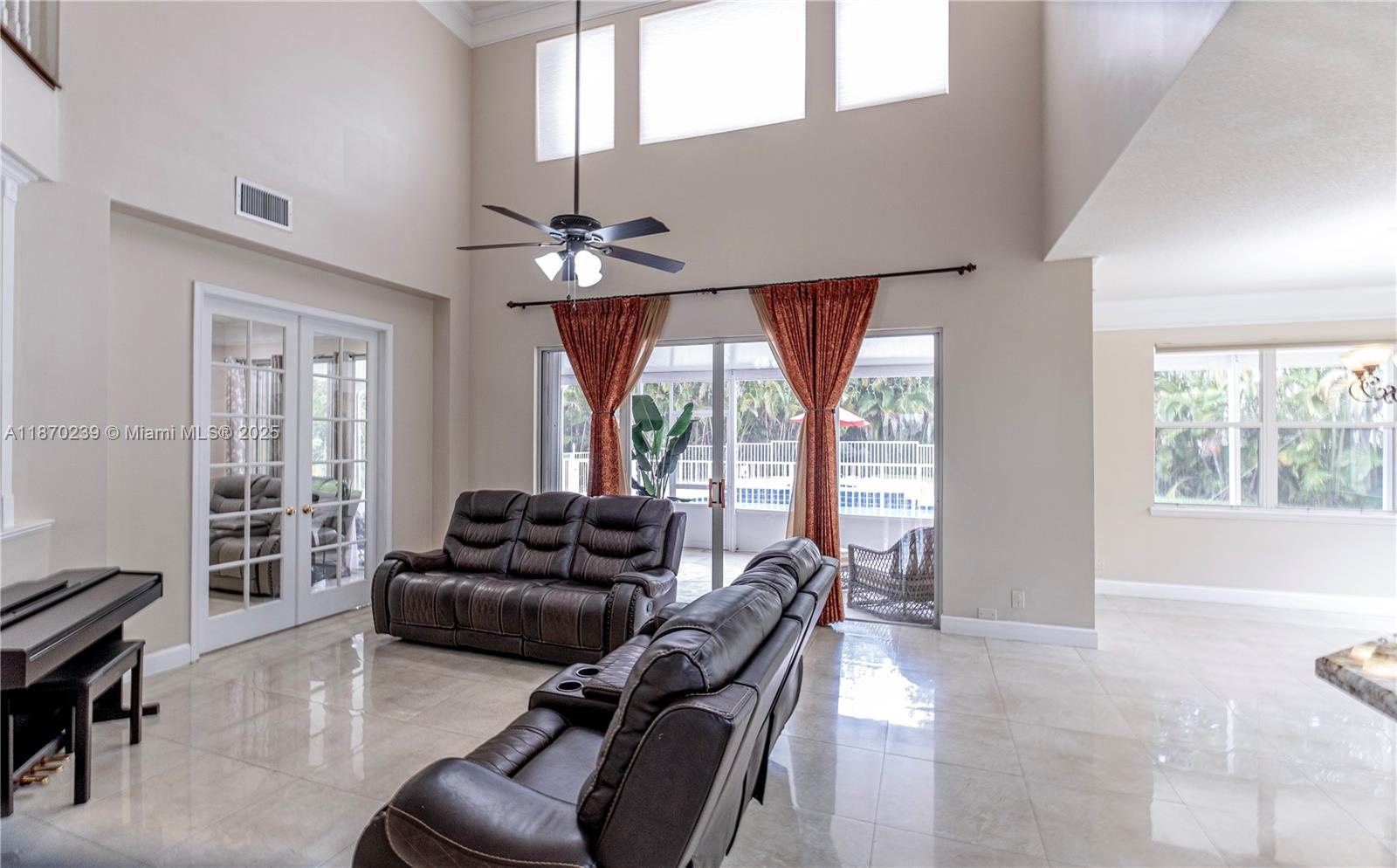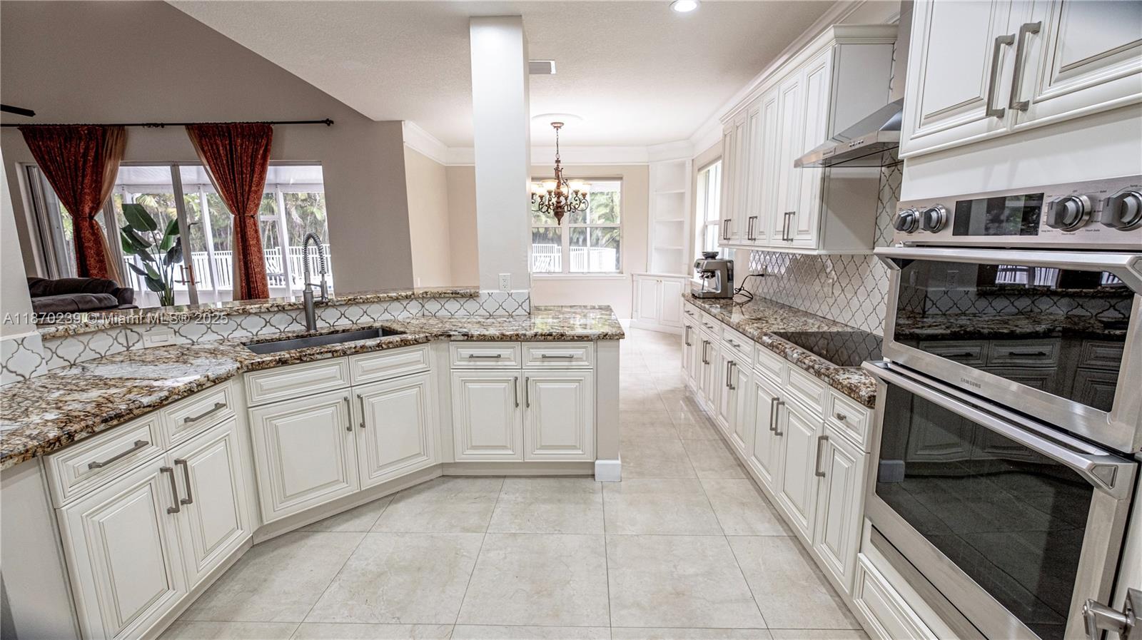 Spacious 6-bedroom + den, 3 ½ bath pool home with a 3-car garage. Perfect for families and entertaining, this home is near top-rated A+ schools, shopping, and major highways. The master bedroom offers two walk-in closets. The upgraded kitchen features wood cabinets, granite countertops, and stainless steel appliances. The first floor has Spanish porcelain floors and 8-foot doors. Smart home technology includes switches, smoke detectors, thermostats, and Ubiquiti Wi-Fi. Enjoy a private backyard with a screened-in lanai, heated saltwater pool, and jacuzzi. Accordion hurricane shutters ensure added safety.