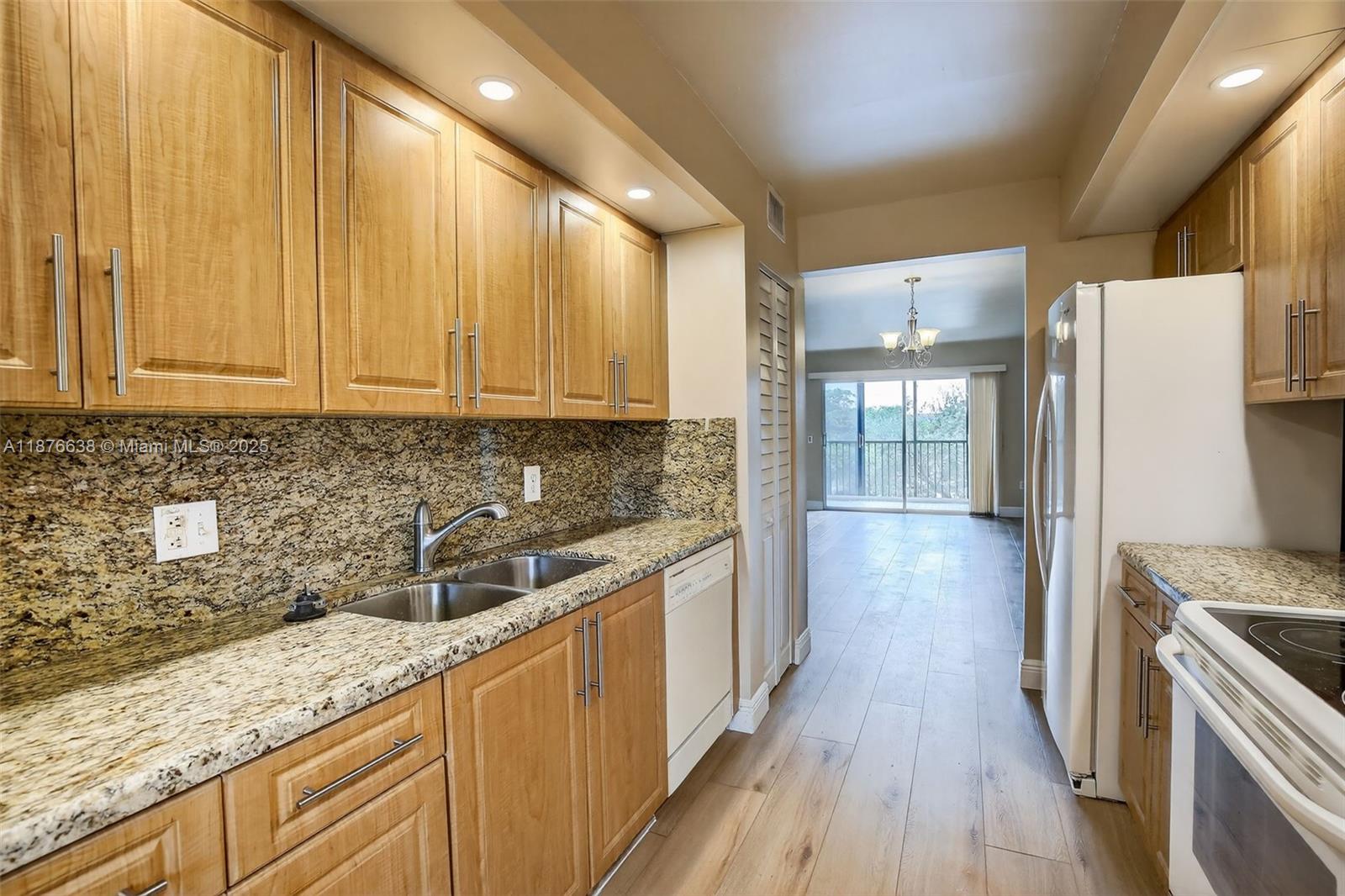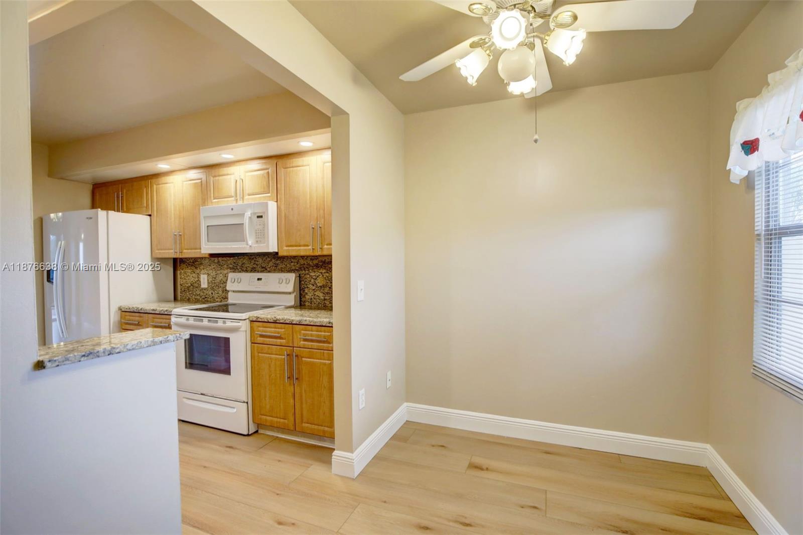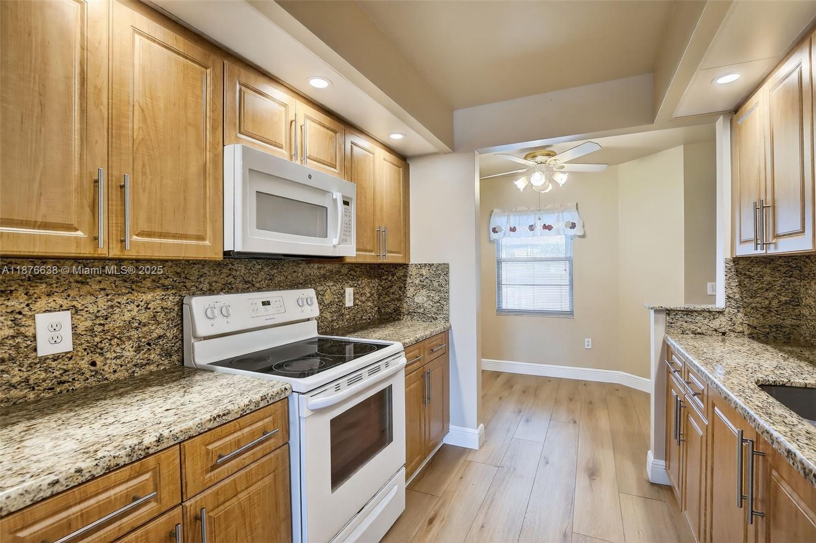 Internet and Basic cable is included in this 55 and up community.This immaculate upgraded 2-bedroom, 2-bathroom third-floor condo kitchen offers both functionality and elegance. The wide galley kitchen seamlessly connects to the dining room, featuring upgraded cabinets with recessed lighting, sleek granite countertops, and a matching backsplash. Equipped with a washer and dryer. The waterproof wood-based laminate flooring adds durability and a touch of sophistication. Both bedrooms showcase spacious walk-in closets, offering ample storage. Feel secluded and at peace with complete privacy from the enclosed patio. Enjoy the out door in air conditioning. Clubhouse, bus transportation,fitness centers, 24 hr security, swimming pools, tennis, movies, theater, billiards, pharmacy, cafe, golf.