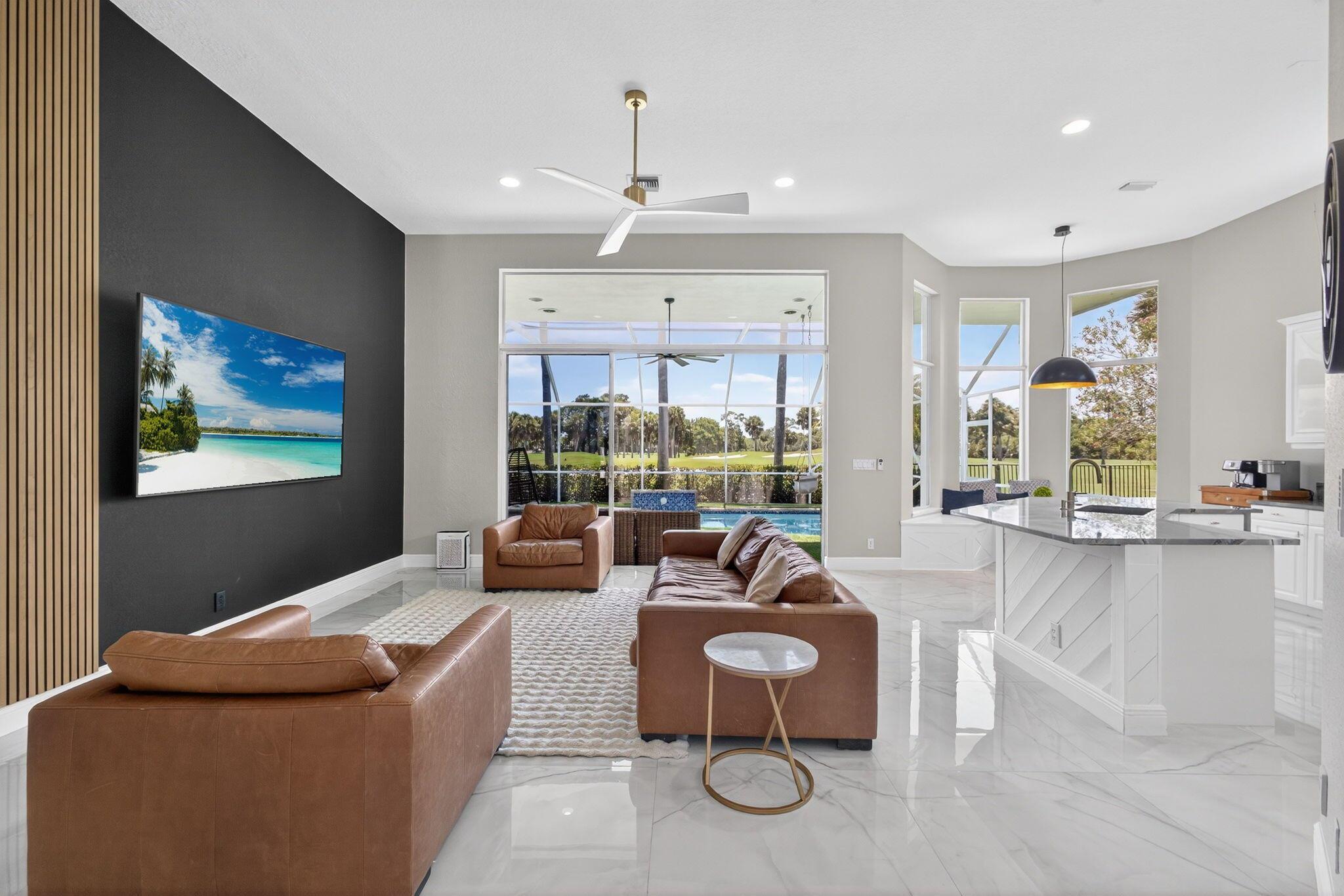 Set on a private cul-de-sac in the boutique Ironhorse community, this updated 4-bedroom, 4-bath ranch styled home offers panoramic views of the preserve, & the renowned Arthur Hills Championship golf course, with no mandatory membership. Be captivated by the 12-ft ceilings with abundant natural light, elegant new porcelain tile floors throughout, a brand-new roof (2024), new A/C, new pool heater, new water heater, new pool pump, new impact double front door, extended driveway & fresh interior & exterior paint. The open-concept kitchen with quartz countertops, a built-in breakfast nook, & a shiplap-accented island, flowing into spacious living areas framed by custom wood panel media wall & sweeping golf views, while the primary suite boasts custom his & hers closets & a spa-style bath.