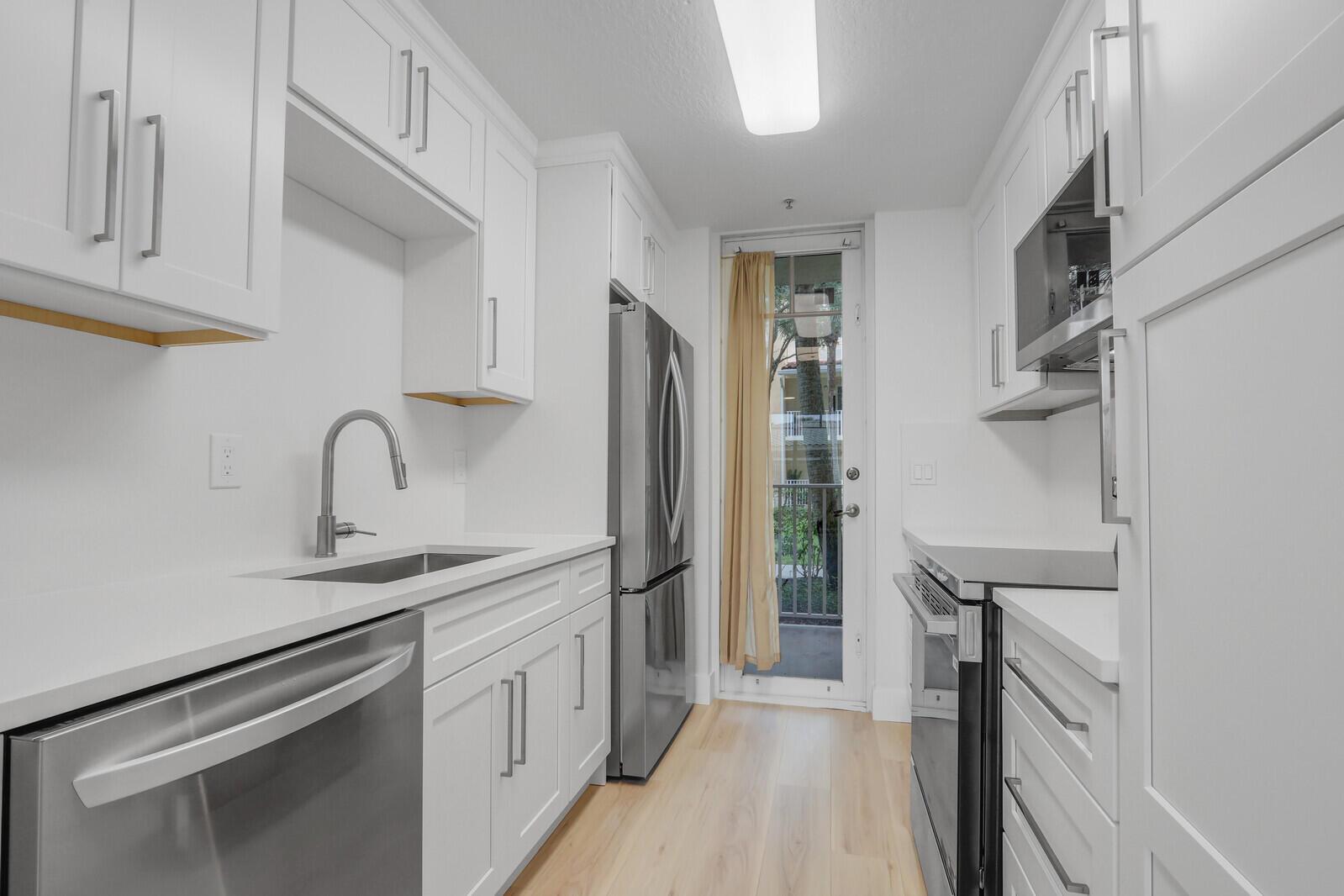 Never lived in, entirely renovated condo located in the Village at Abacoa within walking distance to restaurants, shopping, the stadium, community pool, and fitness center. Features include a brand new kitchen with quartz counters, stainless steel appliances, brand new bathroom with quartz counters, new luxury plank floors, new light fixtures, fresh paint, washer/dryer in unit, assigned parking and more. High speed internet, cable tv, water and sewer are INCLUDED in rent.