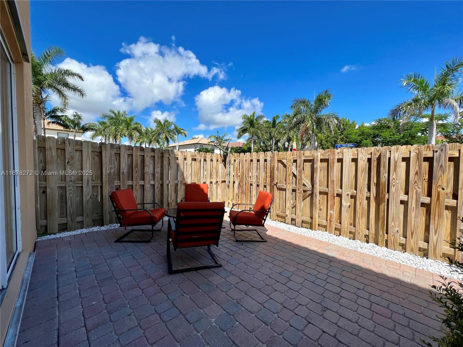This townhouse is a beautifully furnished 3-bedroom, 2.5-bathroom home in Santorini at Islands at Doral. It boasts a prime location, just a short walk or bike ride to two brand-new public parks and top-rated A+ schools. The home is spacious yet easy to maintain, featuring a well-kept kitchen, formal dining area, and a paved backyard. All bedrooms are generously sized, with the master suite offering an expansive bedroom and bathroom. Additional features include a one-car covered garage plus two outdoor parking spaces. Residents also enjoy access to a stunning clubhouse with a variety of amenities.