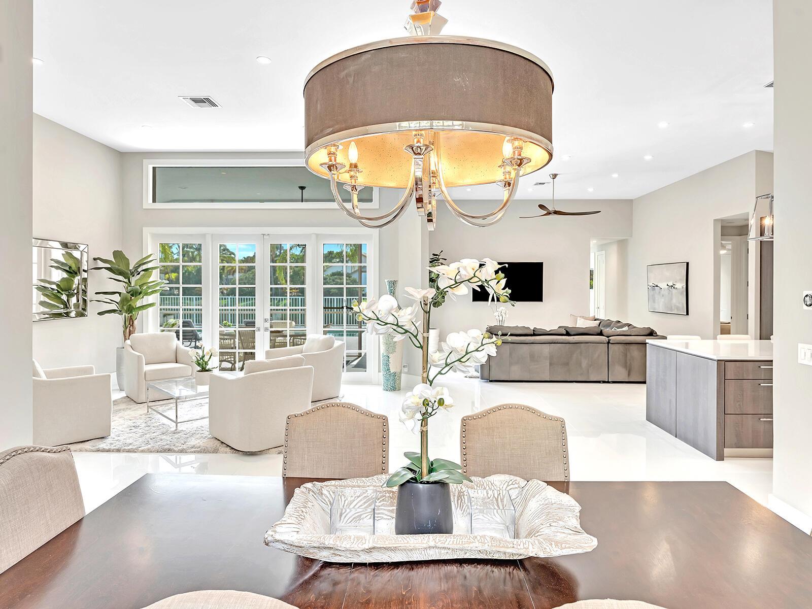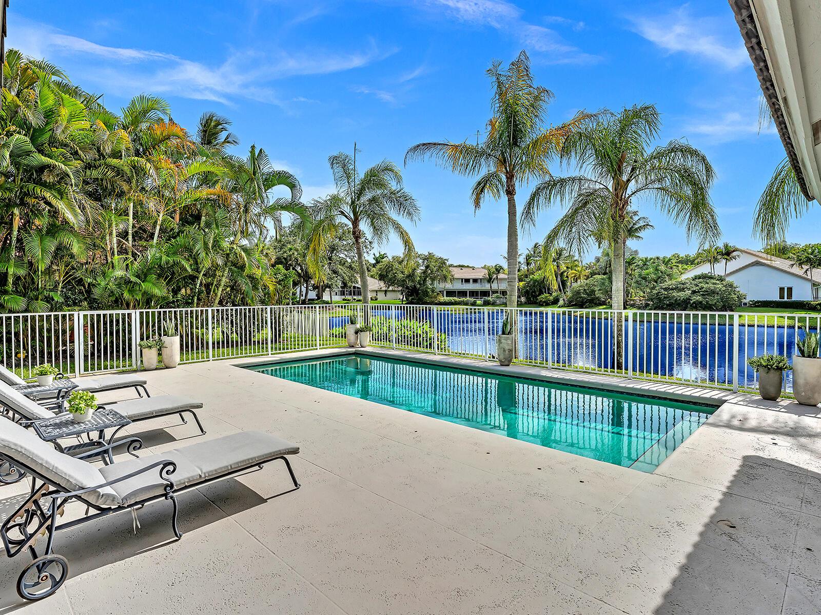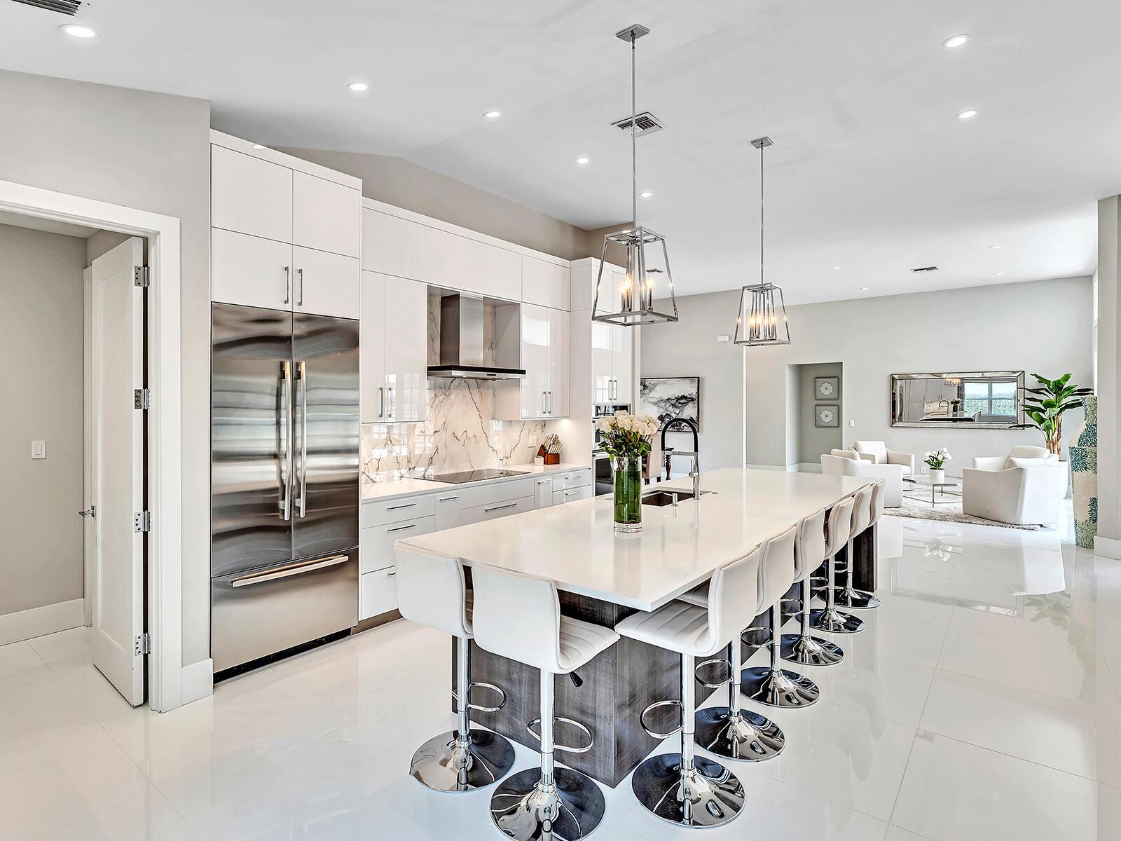 This stunning contemporary 4-bedroom home is located in the highly desirable Andover community. Set among palm trees and live oaks, the 2,754 sq ft residence offers serene lake views, a spacious screened lanai, and an open sports pool. The open-concept design, with soaring ceilings and oversized white glass tile floors, is ideal for entertaining. The custom gourmet kitchen features a 14-foot white quartz island and top-of-the-line stainless steel Jenn-Air appliances, including an induction cooktop and a wine fridge. The master suite boasts a luxurious spa-like ensuite, complete with a large soaking tub and a walk-in shower for ultimate relaxation. Andover is a charming, family-friendly gated community, located just minutes from downtown Delray Beach, residents enjoy convenient access