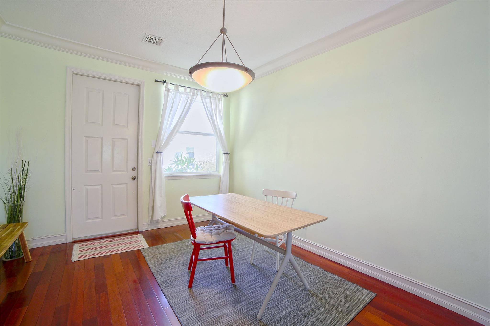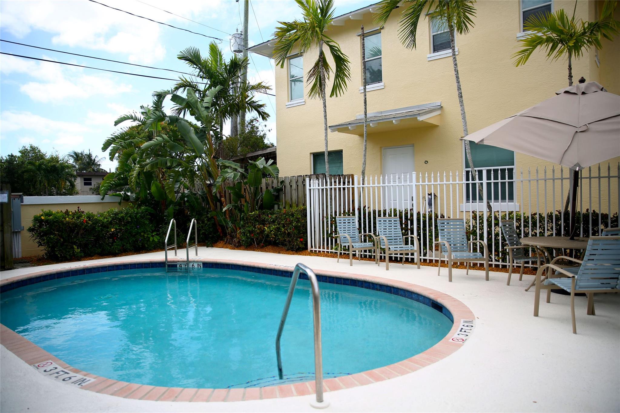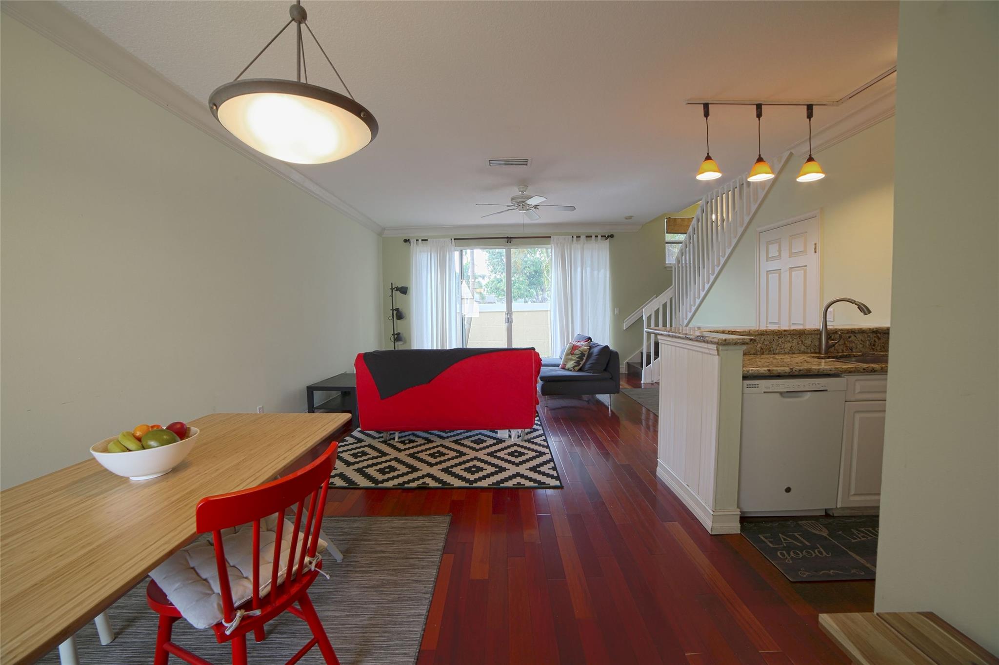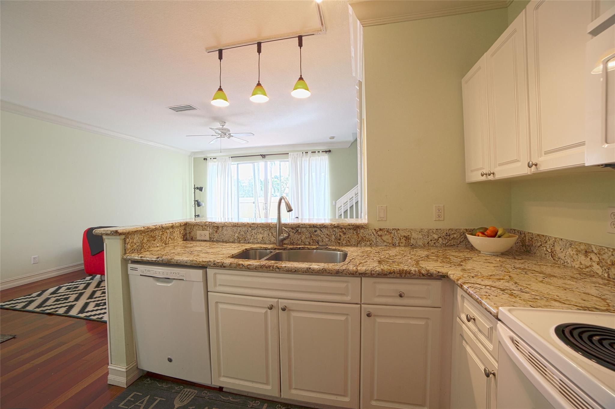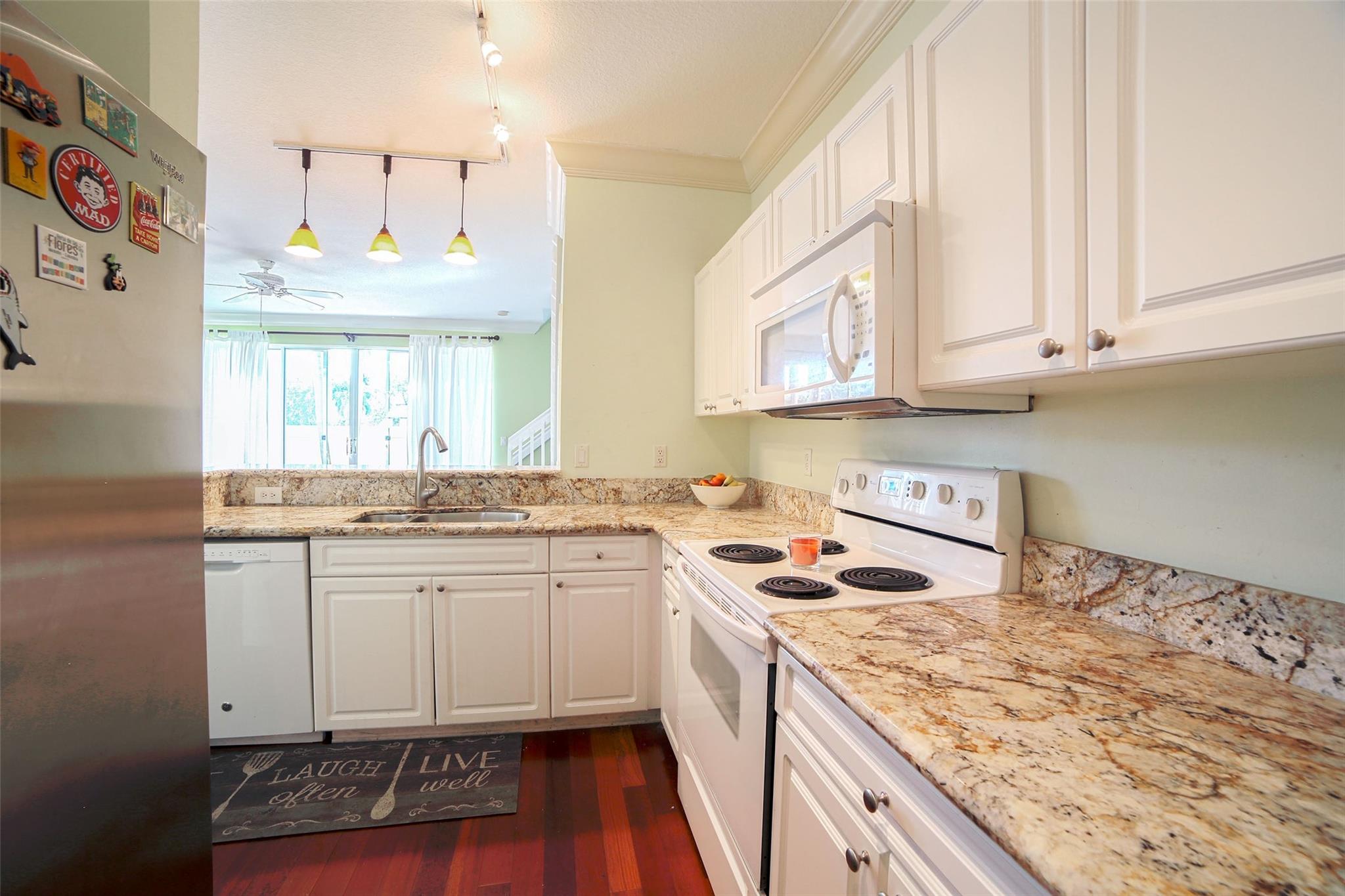 Centrally and conveniently located near shops, dining, beach and entertainment. This is lovely and spacious two-story townhouse with soaring high volume ceilings with lots of natural light and cherry wood floor throughout the ground level, which consists of a formal living and dining, kitchen, a half-bathroom and one car garage; White wood cabinets, and granite counter-tops in the kitchen. Laminate-wood floors upstairs which consists of two bedrooms and two bathrooms. There is a charming patio, perfect for BBQ and entertaining. Walk to the community pool. The location is ideal, just 1 mile from the beach and walking distance to Deerfield Elementary