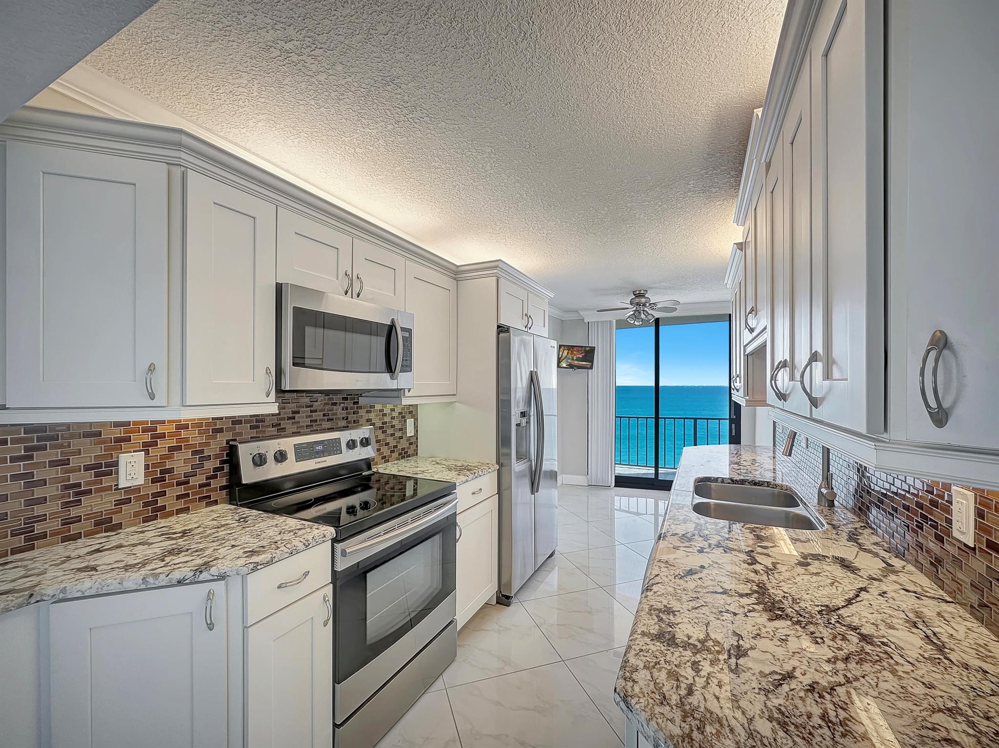It's all about the views - enjoy the crystal blue ocean from every room in this front corner unit. The 2BR / 2BA split BR plan features a neutral color palette & polished ceramic tile throughout. Updated kitchen w/ granite counters, stylish backsplash & stainless appliances. Small nook off kitchen opens on to the balcony & overlooks the Atlantic - perfect location for morning coffee or cocktails. Large laundry room w/ washer dryer inside unit. Impact sliders throughout. Cote D'Azur has fob access to front gate & each tower. On-site manager M-F. Pool, grills & large outdoor social area between the two towers. Gym, community room, library & tennis and pickleball courts. 15 minutes to world class shopping, dining.