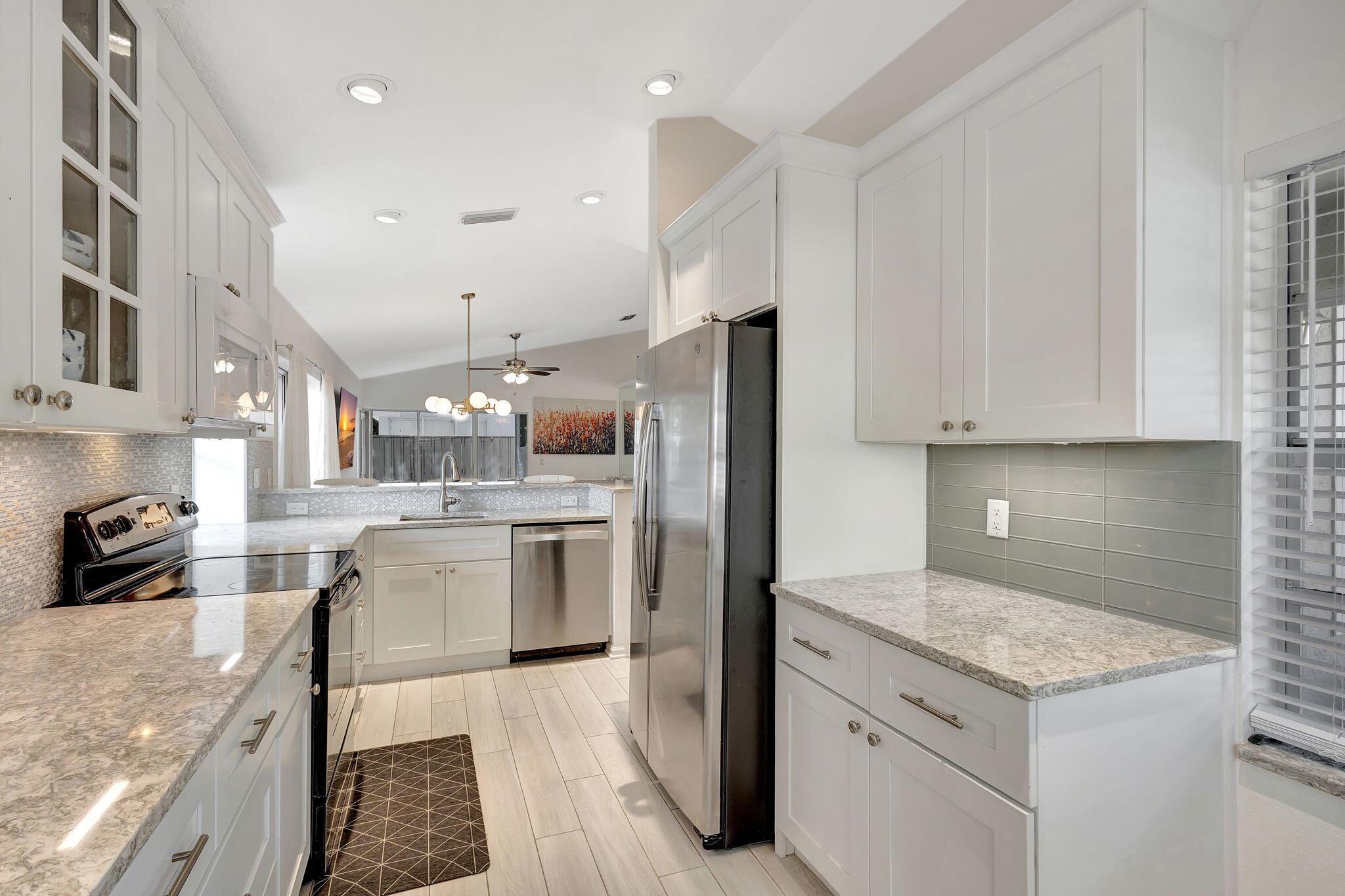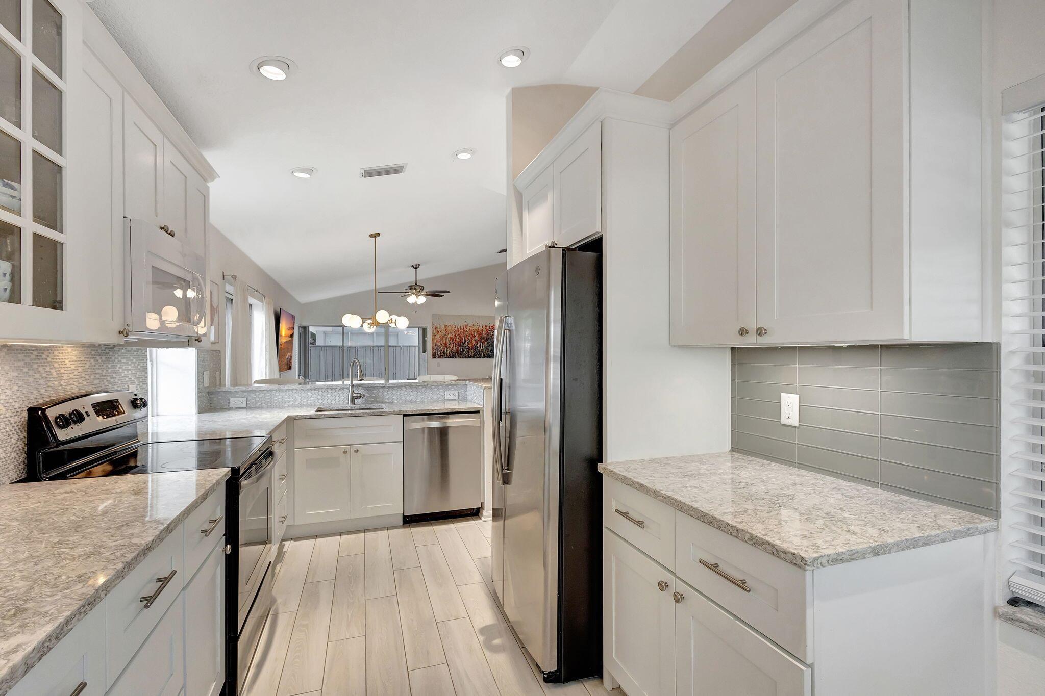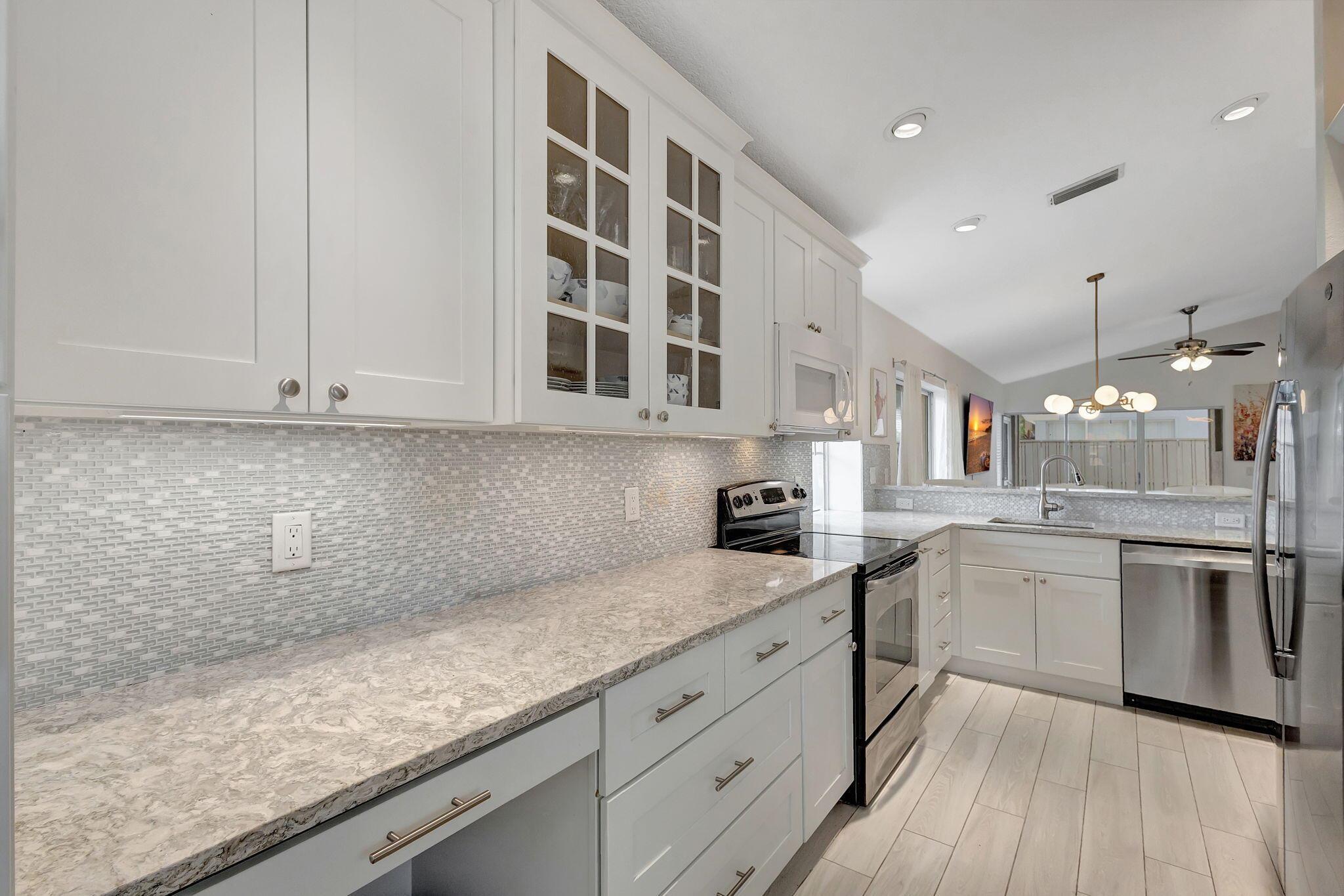 Bristol Club at PGA National. Remodeled two-bedroom, two-bathroom single-family home located on a private end lot in a cul-de-sac. Community consists of single-family homes only, offering a private setting. Home features high-end finishes and an open floor plan with combined living, dining, and kitchen areas. Primary suite includes walk-in closet, double vanity, and shower. Second bedroom can be used as guest room or office. Screened porch, fenced yard, and assigned parking. Move-in ready. Pet-friendly community in PGA National, close to shopping, dining, golf, and major roadways.