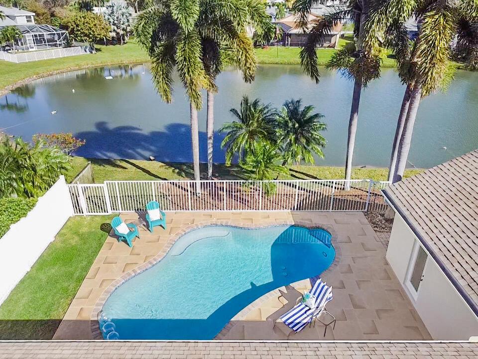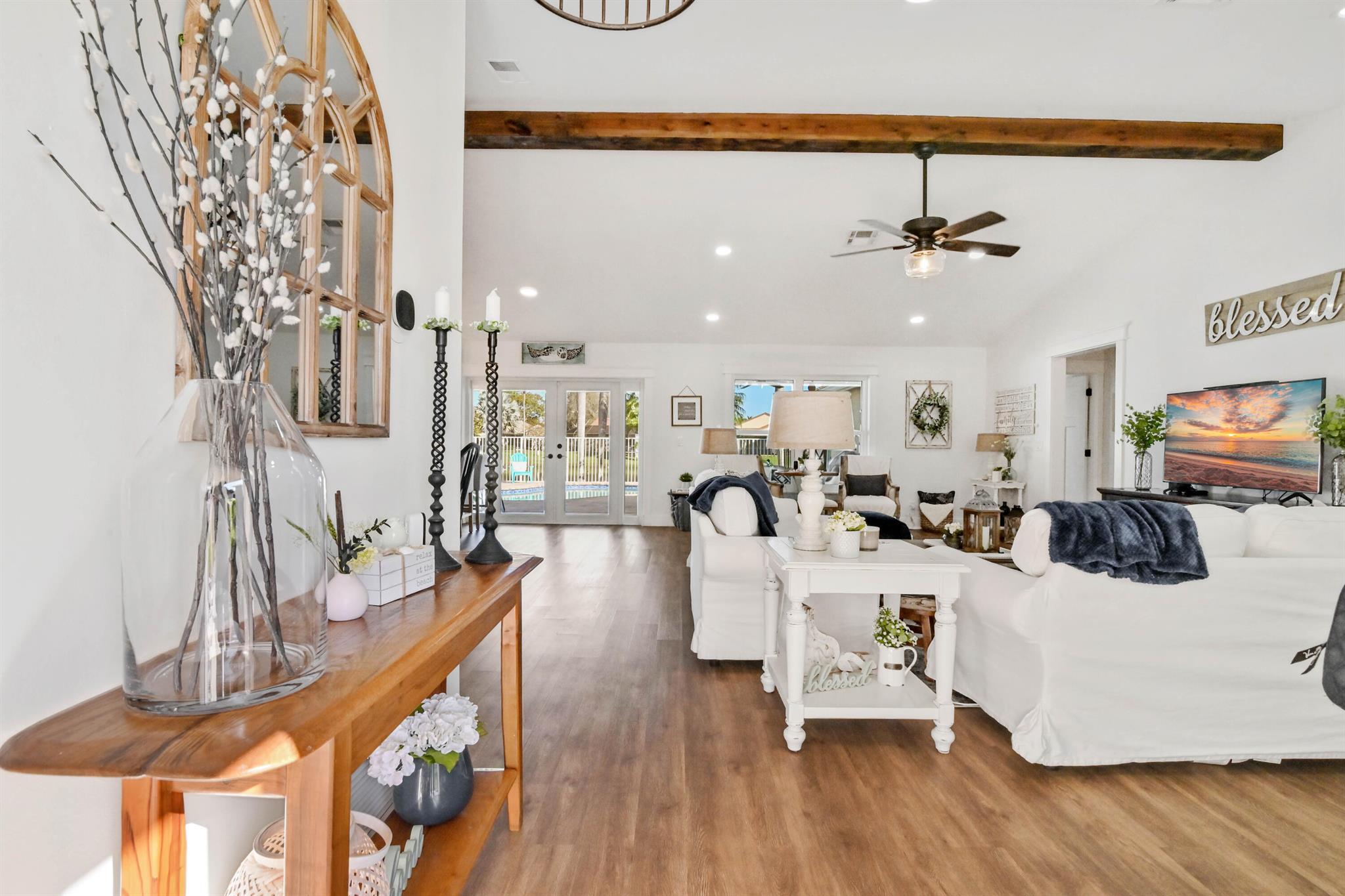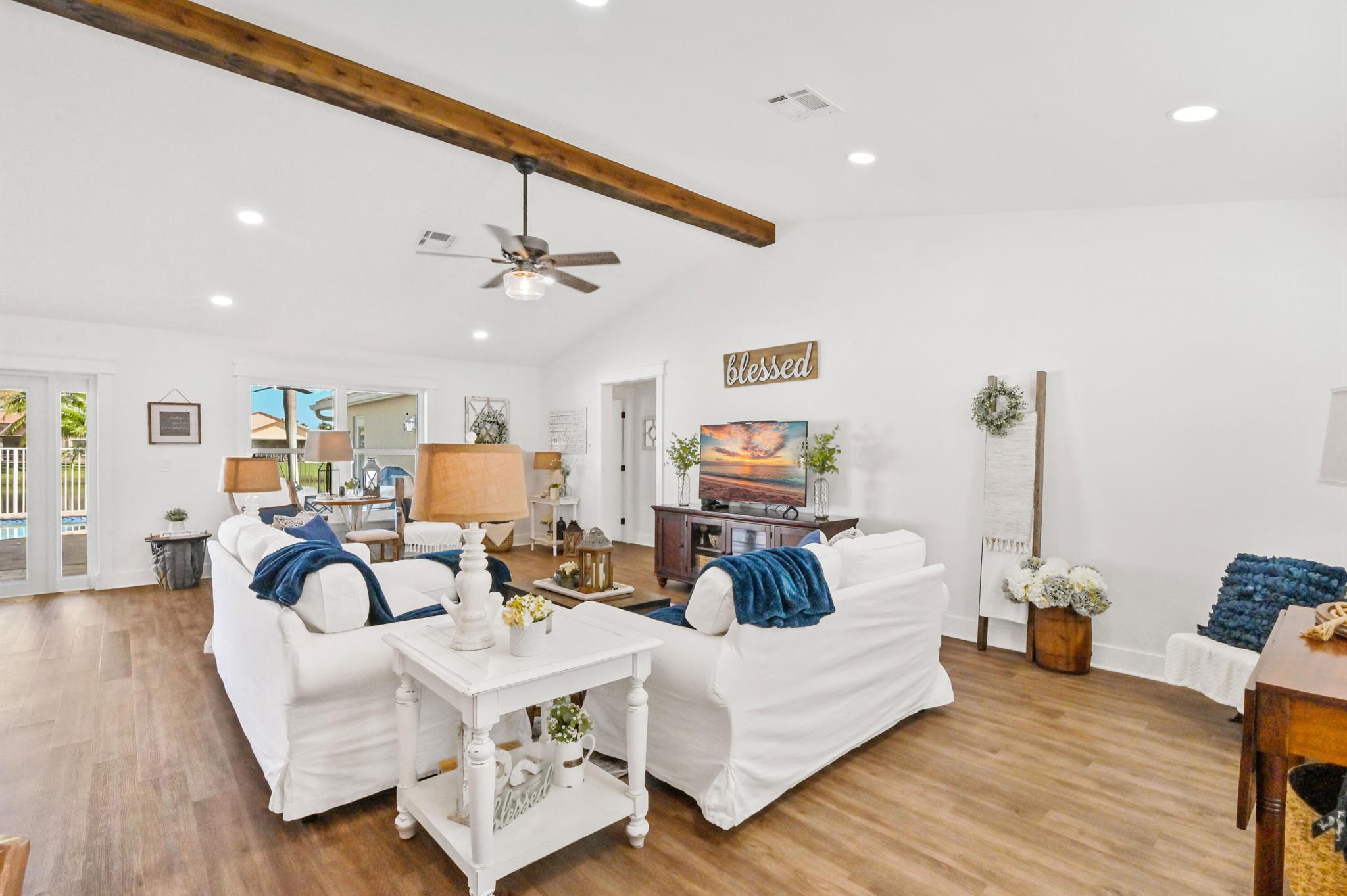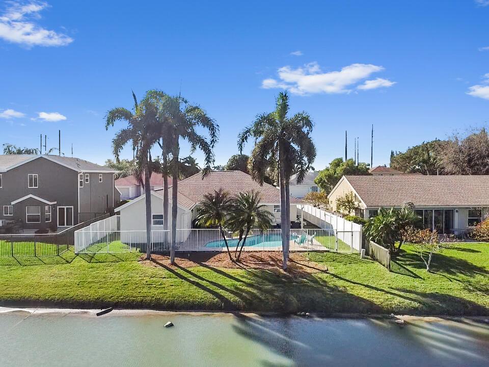 Welcome to this meticulously maintained 4-bedroom, 2-bath waterfront haven with a private pool, nestled in a serene setting with a fenced rear yard and breathtaking lake views. Step inside this true 4-bedroom gem, where an immaculate open floor plan unfolds seamlessly, offering a family room, living room, and formal dining area. The kitchen, adorned with modern appliances and quartz countertops boasts generous counter space, and a spacious pantry, ensuring culinary delights in a stylish setting. This beautiful home also features luxury vinyl flooring throughout, vaulted ceilings with a wood beam, custom trim around doors, and a full size washer and dryer.