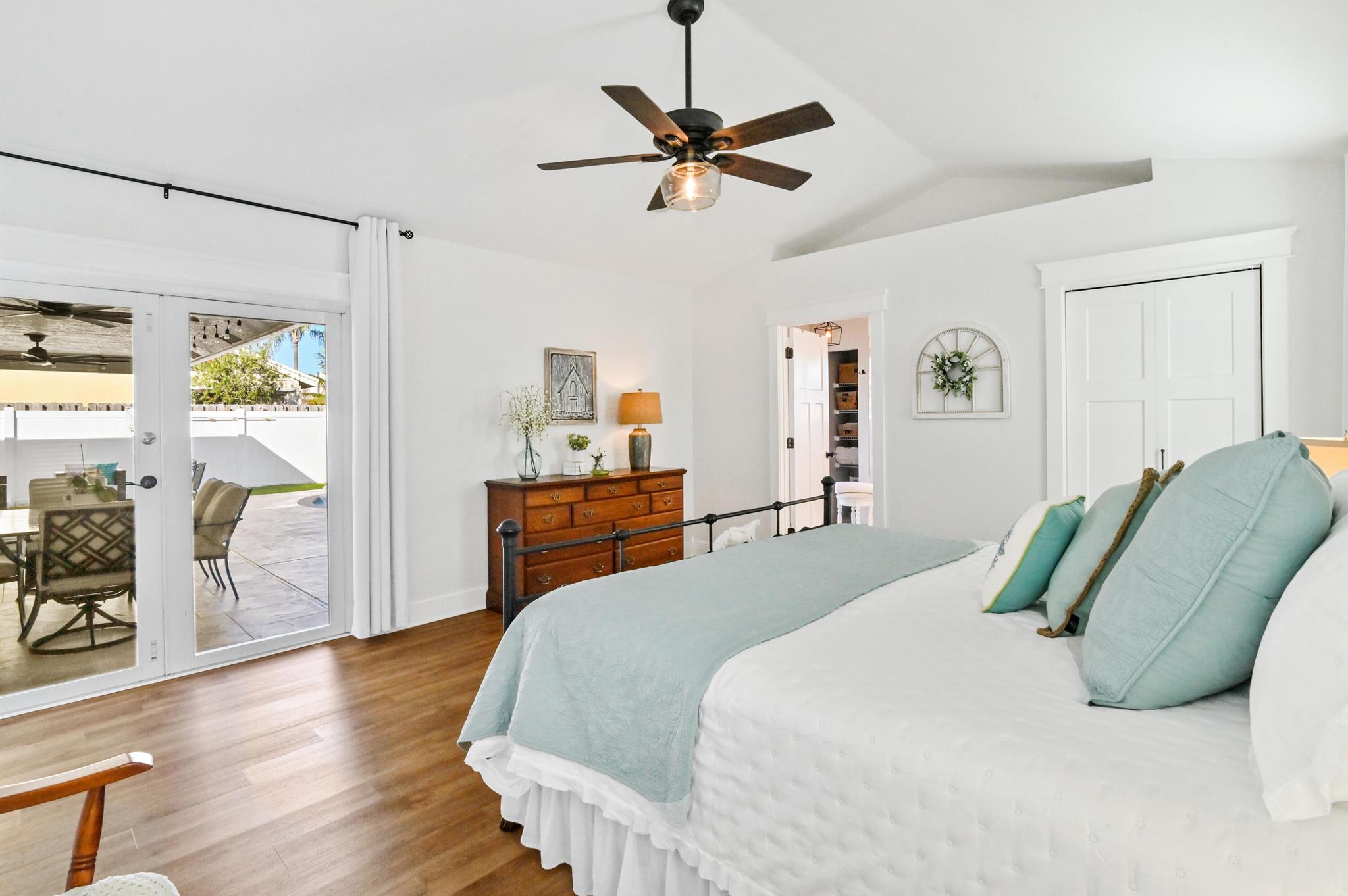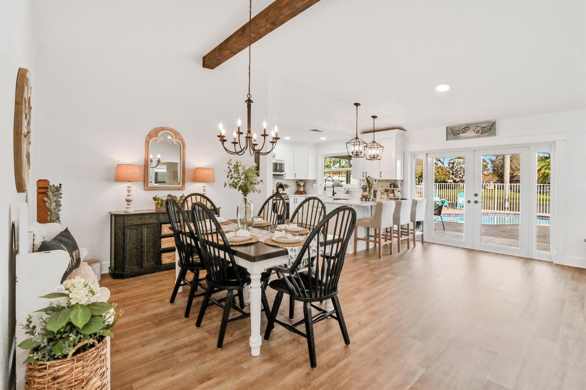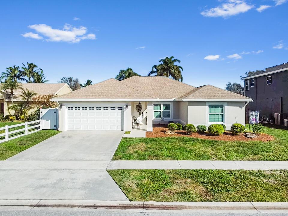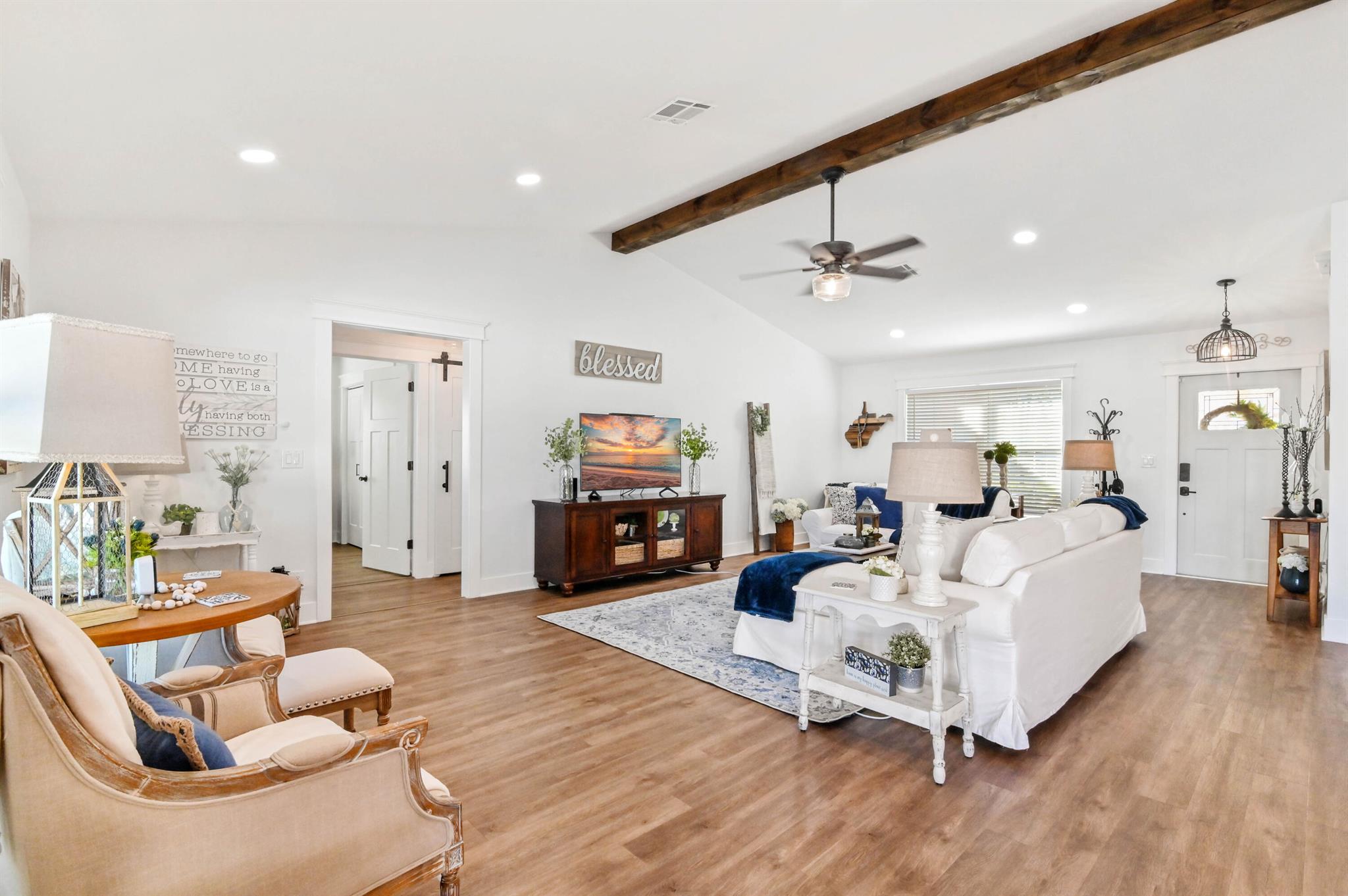 Welcome to this meticulously maintained 4-bedroom, 2-bath waterfront haven with a private pool, nestled in a serene setting with a fenced rear yard and breathtaking lake views. Step inside this true 4-bedroom gem, where an immaculate open floor plan unfolds seamlessly, offering a family room, living room, and formal dining area. The kitchen, adorned with modern appliances and quartz countertops boasts generous counter space, and a spacious pantry, ensuring culinary delights in a stylish setting. This beautiful home also features luxury vinyl flooring throughout, vaulted ceilings with a wood beam, custom trim around doors, and a full size washer and dryer.
