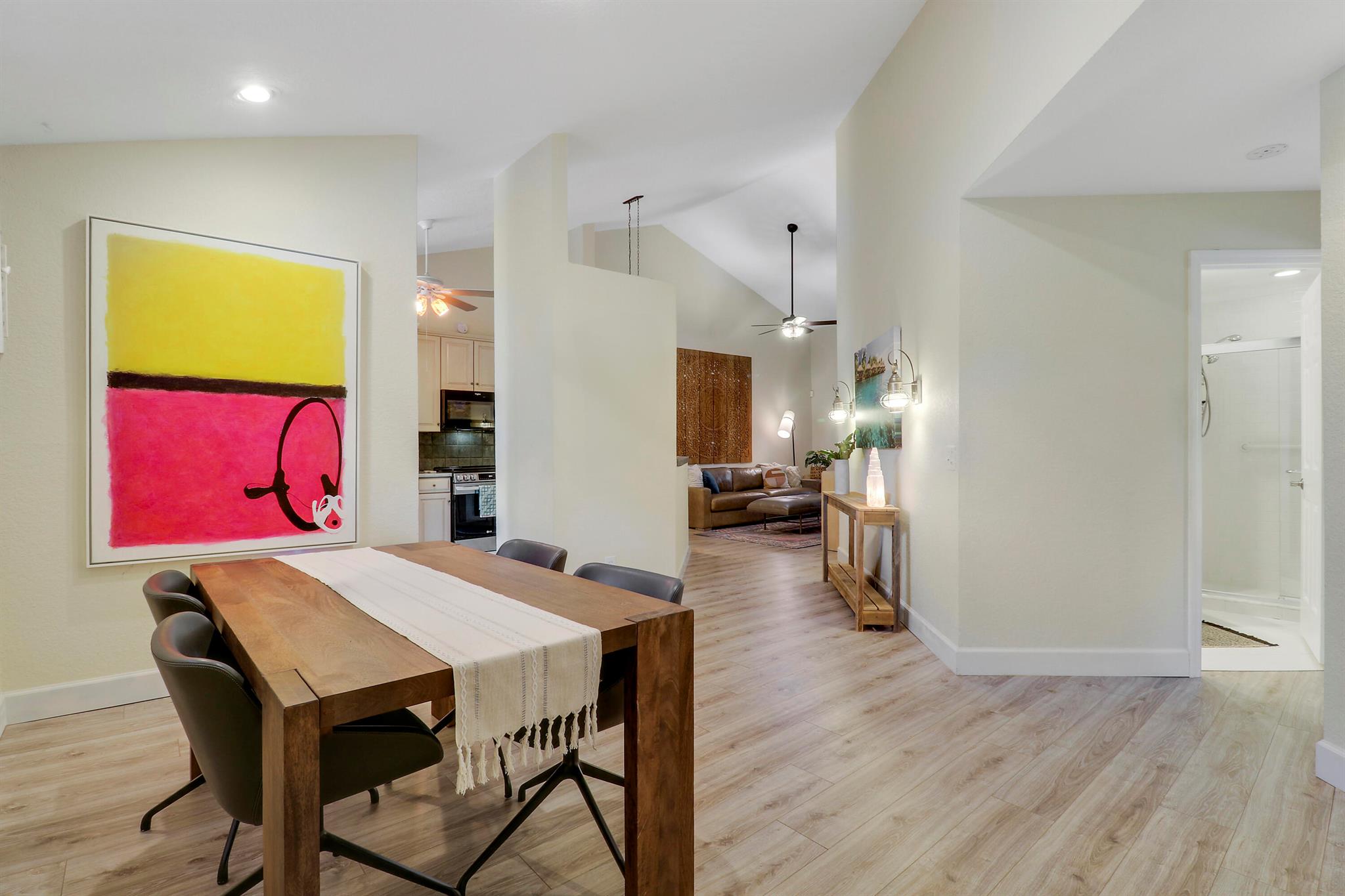 Step into this light and inviting three bedroom, two bath home with a private one car garage in the desirable community of Sea Oats. Inside you will find Biscayne Oak laminate flooring and baseboards recently installed throughout, along with a new air conditioner in 2022 and a new water heater in 2023. The kitchen features a new impact window, stainless steel refrigerator and stove and updated fixtures and fans that add a modern touch. A light filled built in office creates the perfect space for working from home. Sea Oats offers residents a relaxing coastal lifestyle with a community pool, tennis courts, and on-site management. The location could not be better, only half a mile from the beach, four minutes to Juno Pier, and just ten minutes to the restaurants and shopping