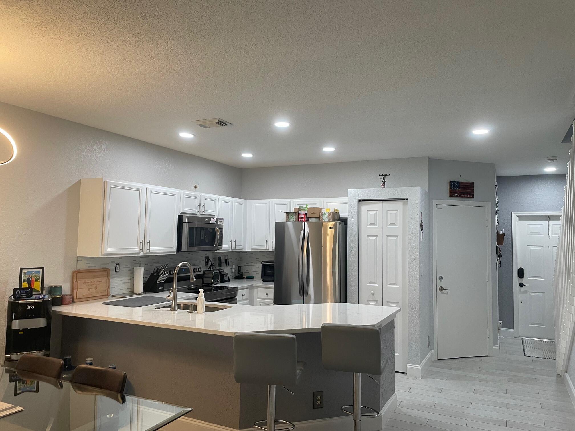 Such a beautiful, move-in ready all ages TH in Wellington. Hurricane protection. OPEN, light and bright, white kitchen with SS appliances with large countertop, great for entertaining and for bar stools. Pantry included. Coffee/liquor bar. Gorgeous tile floors on the first floor. Half bath on the first floor for guests. Newer luxury window treatments. Screened patio with storage. Second floor loft/home office/playroom/exercise room. Guest bedroom could have private bathroom. The primary suite is bright and large. White and bright bathroom, double sinks, shower with window. Short walk to pool. Easy access to all that is Wellington. Great local landlord.