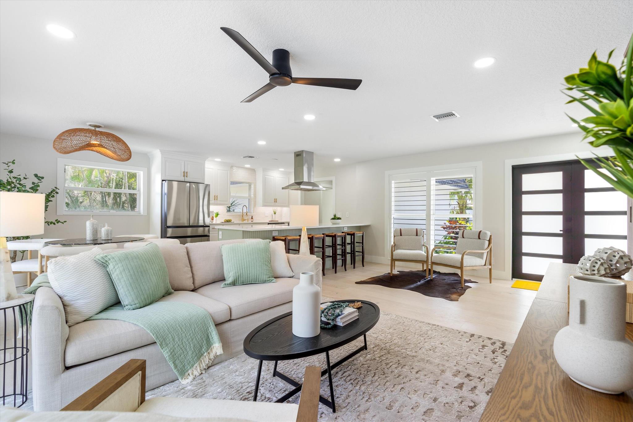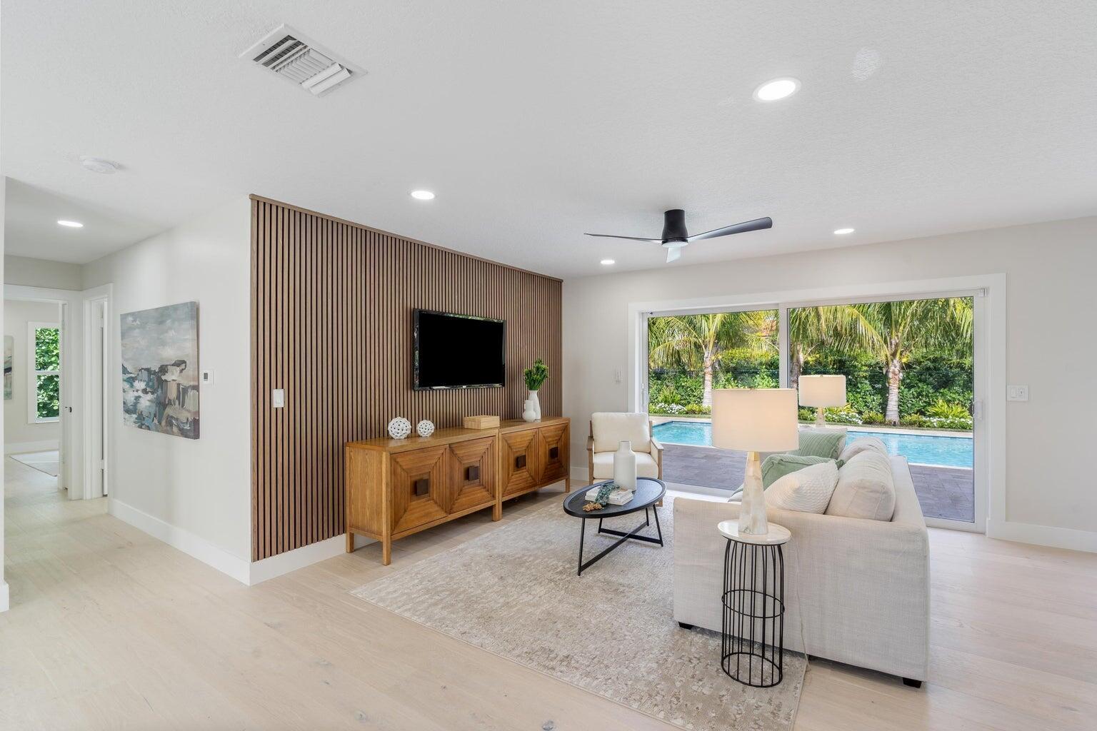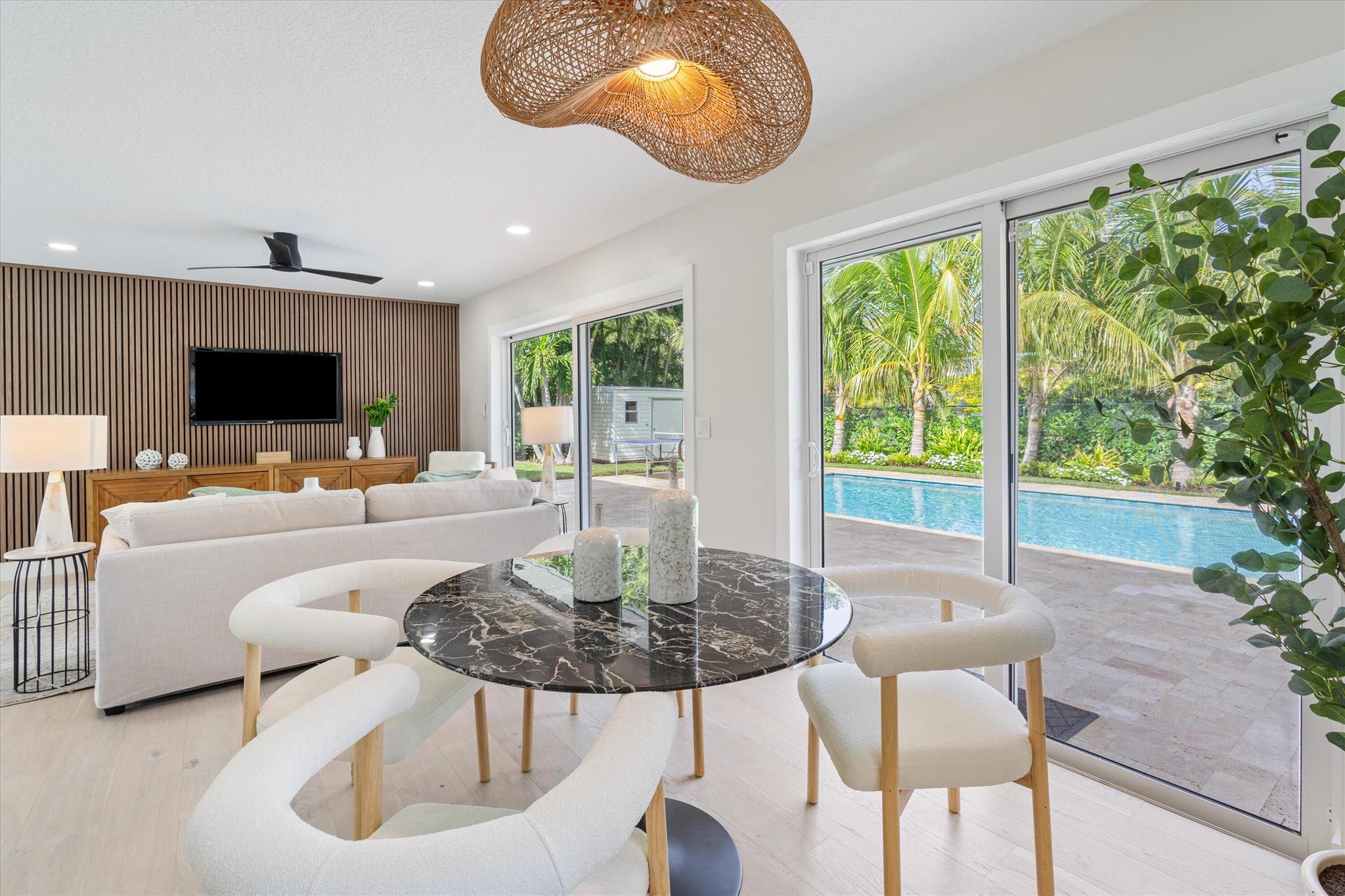 Newly renovated pool home in Hypoluxo Point. 4 Bedrooms 3 Full Baths. Fenced private back yard, tropical landscaping. Impact windows and doors. 2 bathrooms walk in showers. 3rd has a bathtub. Wood floors, recessed lighting. Bright open kitchen with cook island. Split bedrooms, built-in closets. Backyard has full outdoor kitchen with arbor. Water view of intracoastal. Great space for entertaining with large extended patio. Outdoor shower. Room for a golfcart on side yard. Full size Washer/Dryer. Double driveway. Close to beaches, waterfront dining. 18 minutes to PBI airport. Storage shed in back yard. Pool has a child safety fence available. Rent includes yard & pool maintenance. No Homeowner Association. Available for occupancy November 21, 2025. UNFURNISHED. Some photos have staging.