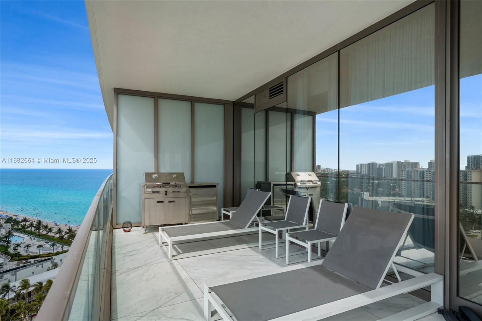 Discover refined coastal living in this 2BR/2BA corner residence at Armani Casa Tower. Featuring 1,212 sq. ft. of interiors and an expansive 1,000 sq. ft. wraparound balcony with summer kitchen, this fully furnished home offers panoramic ocean, Intracoastal, and skyline views from every room. Designed with 10-ft floor-to-ceiling windows, an open layout, and a gourmet kitchen with top-tier appliances, the residence blends elegance with functionality. The primary suite includes a spa-inspired bath with soaking tub, glass shower, and walk-in closet. Set on a 3.2-acre oceanfront site, residents enjoy exclusive amenities: heated pools, spa, sauna, fitness center, children’s play area, social lounges, valet, and direct beach access. A true luxury lifestyle in the heart of Sunny Isles Beach.