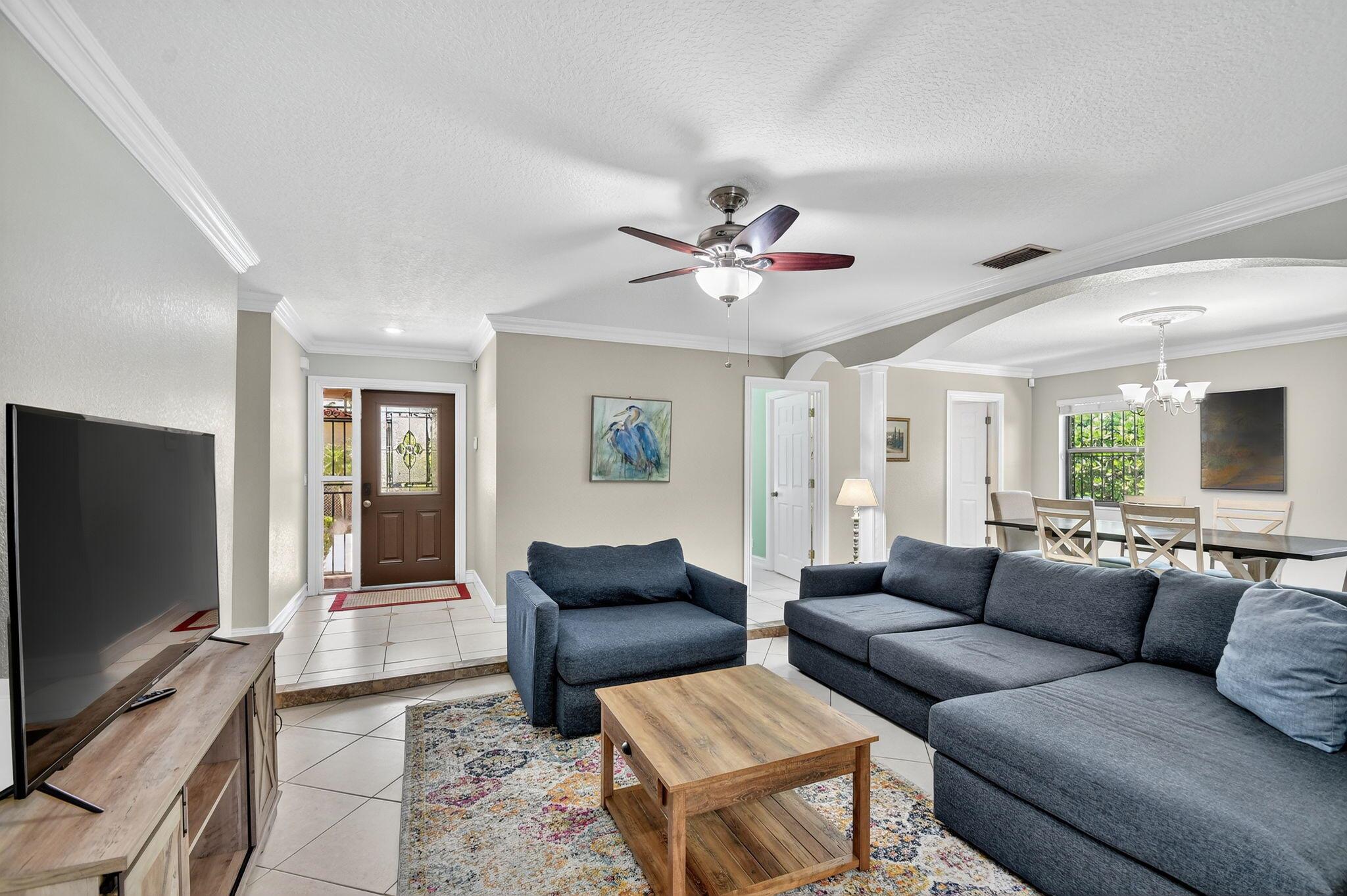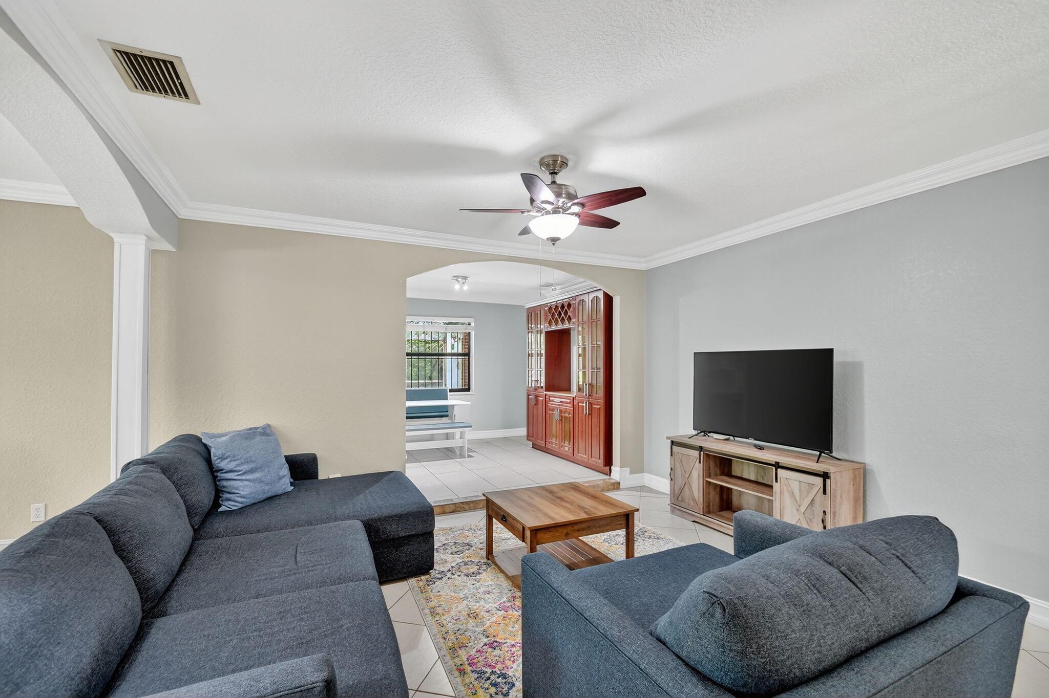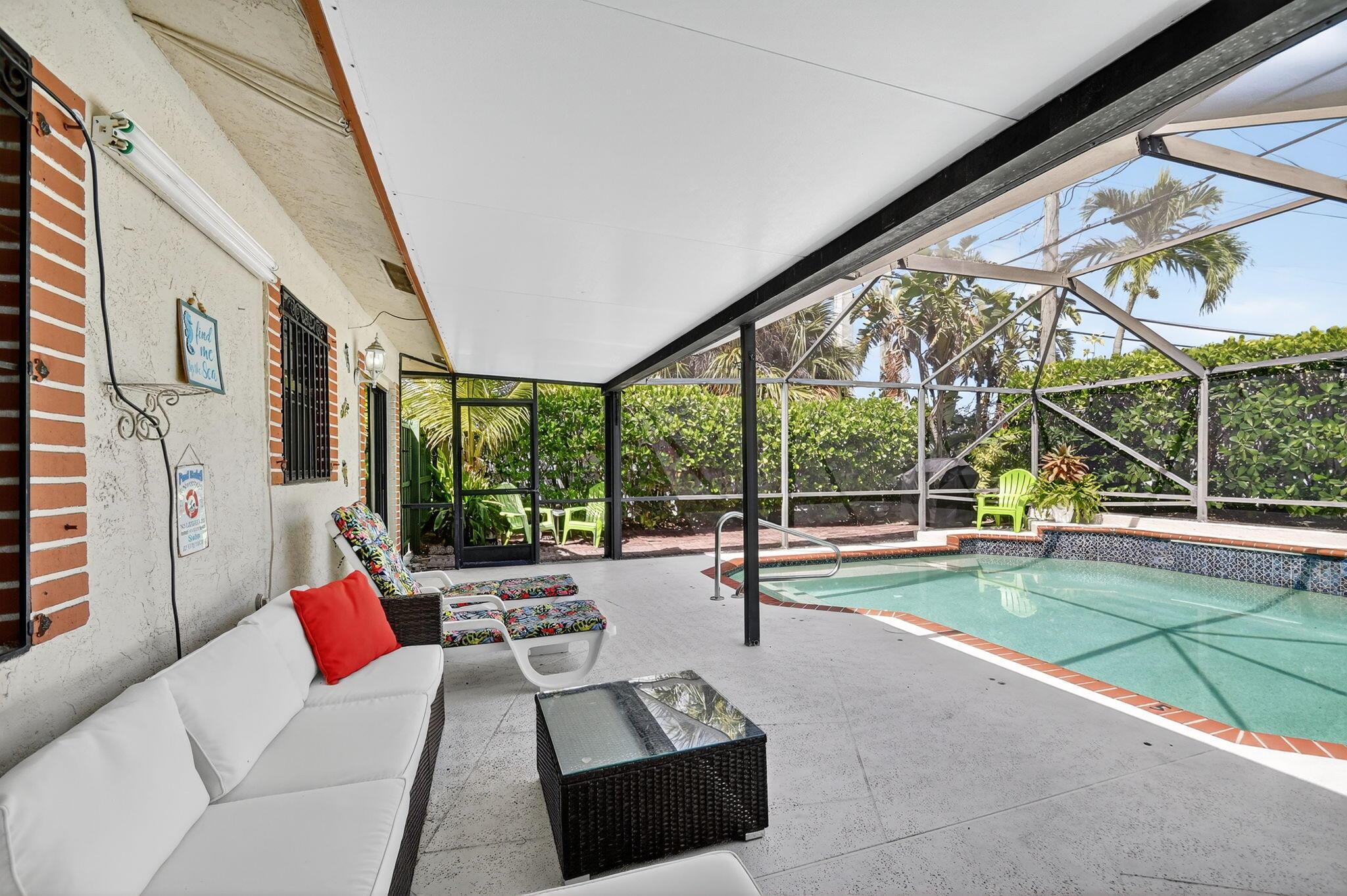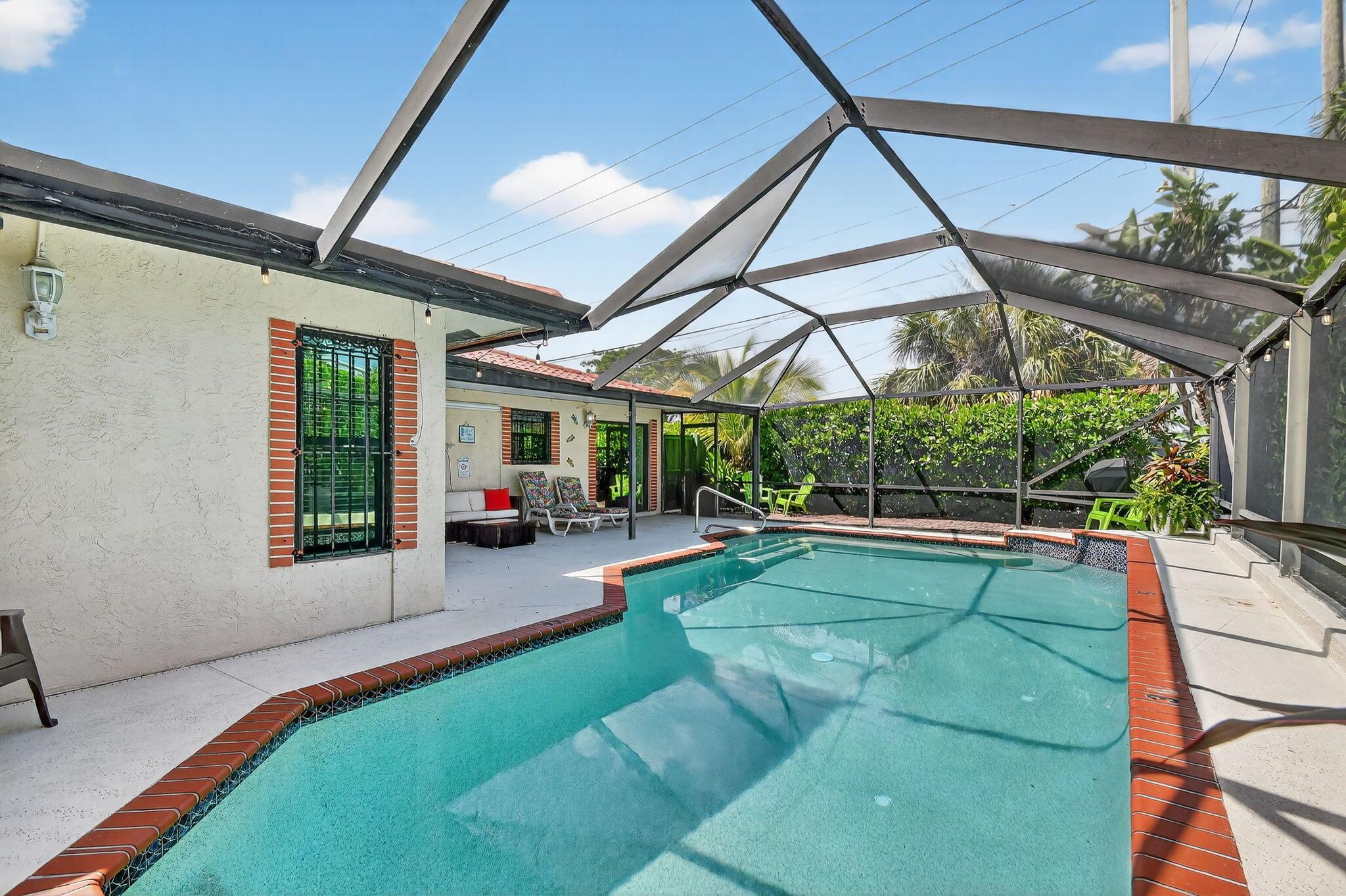 Turnkey furnished rental at the end of a quiet cul-de-sac, directly next to Dreher Park--home to the Palm Beach Zoo and the Cox Science Museum & Aquarium. Just minutes to downtown West Palm Beach, the Norton Museum, dining, shopping, and nightlife on Clematis Street and The Square. The beach is only a short drive away, offering the best of Florida living. This bright, open home features impact windows throughout, a spacious island kitchen with granite counters and stainless appliances, and a split-bedroom layout for privacy. The master suite includes a walk-in closet and large bath. Sliding impact doors lead to the screened, heated pool with seating, waterfall, and a fenced yard surrounded by lush clusia hedges. Fully furnished and equipped--ready for your next stay