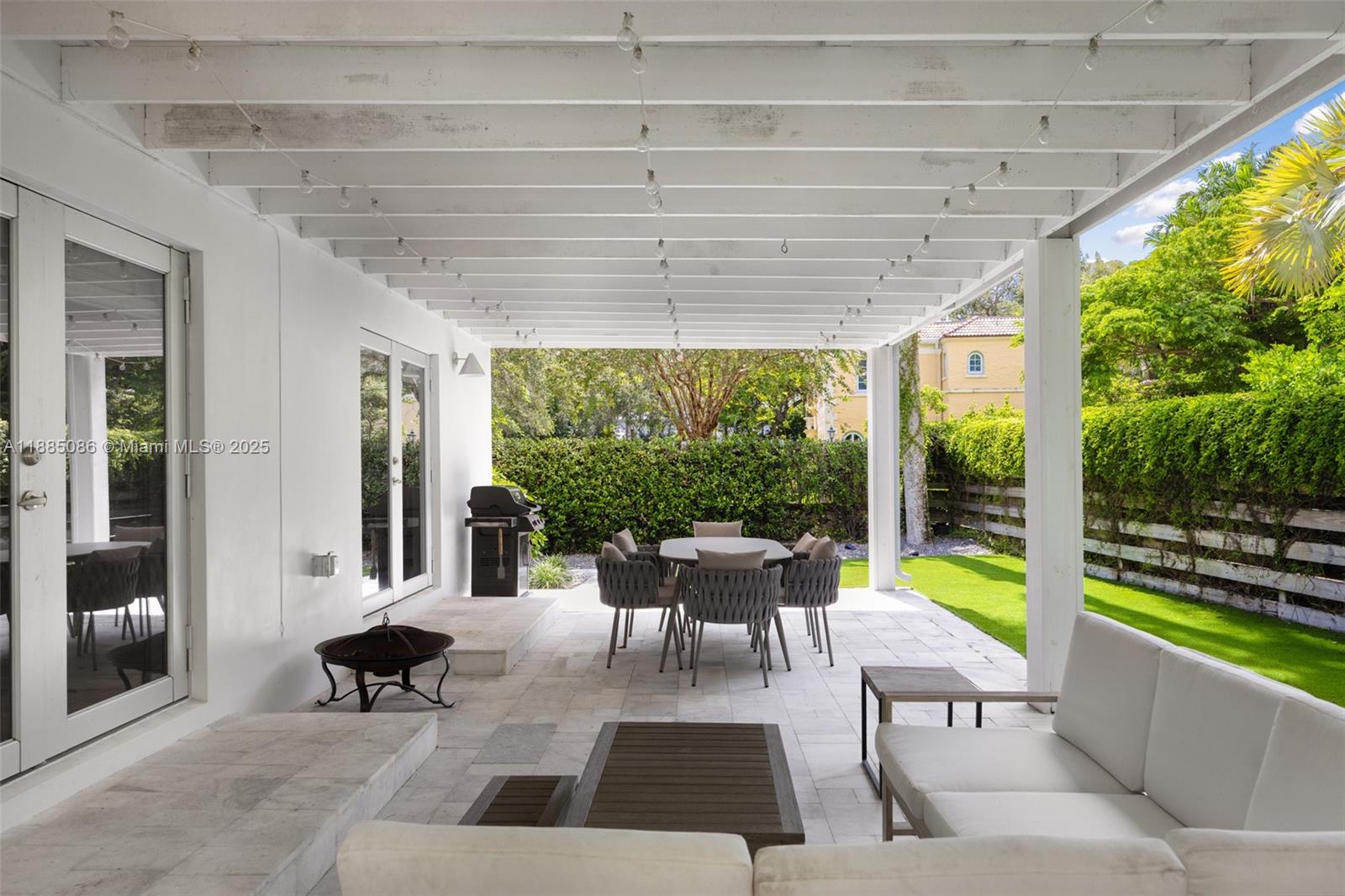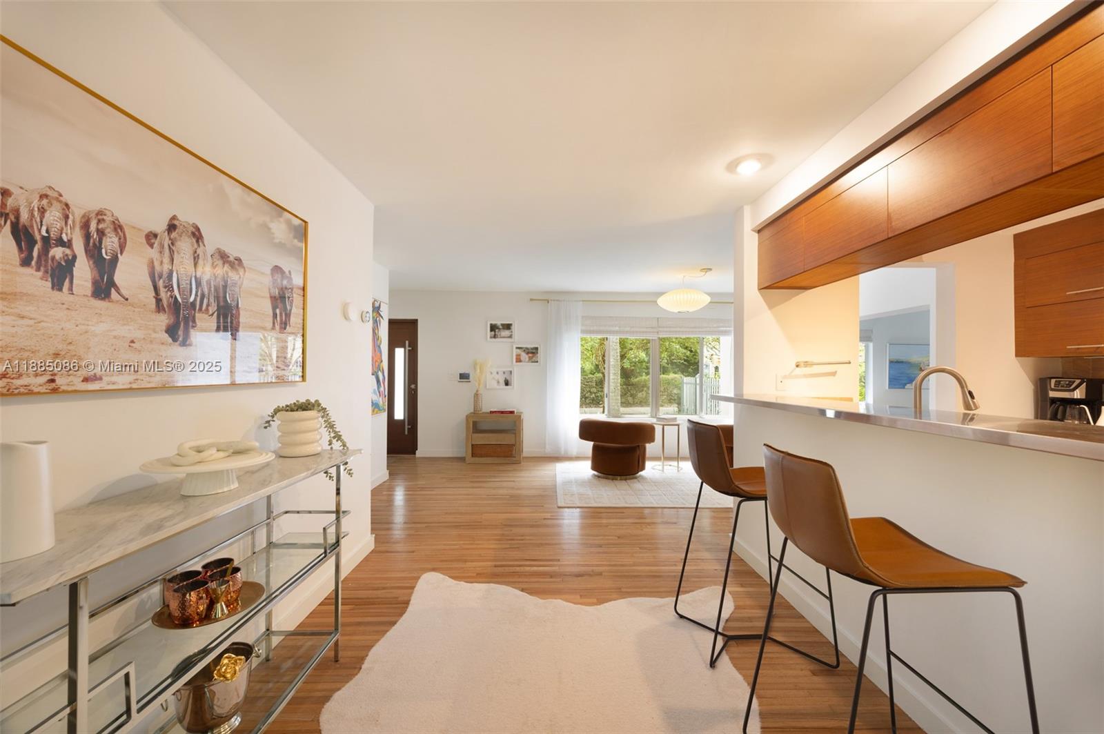 Modern design meets tropical tranquility in this renovated Coconut Grove retreat on sought-after Bougainvillea Rd. Just moments from village cafés, parks, and marinas, the home features impact glass, a new roof, and light-filled interiors with 10-ft ceilings and wood floors. The Euro-style kitchen showcases Italian teak cabinetry, stainless countertops, and premium appliances. A spacious primary suite offers a spa-like bath, walk-in closet, and garden views. Enjoy effortless indoor-outdoor living with a covered terrace and turf yard ideal for year-round entertaining.