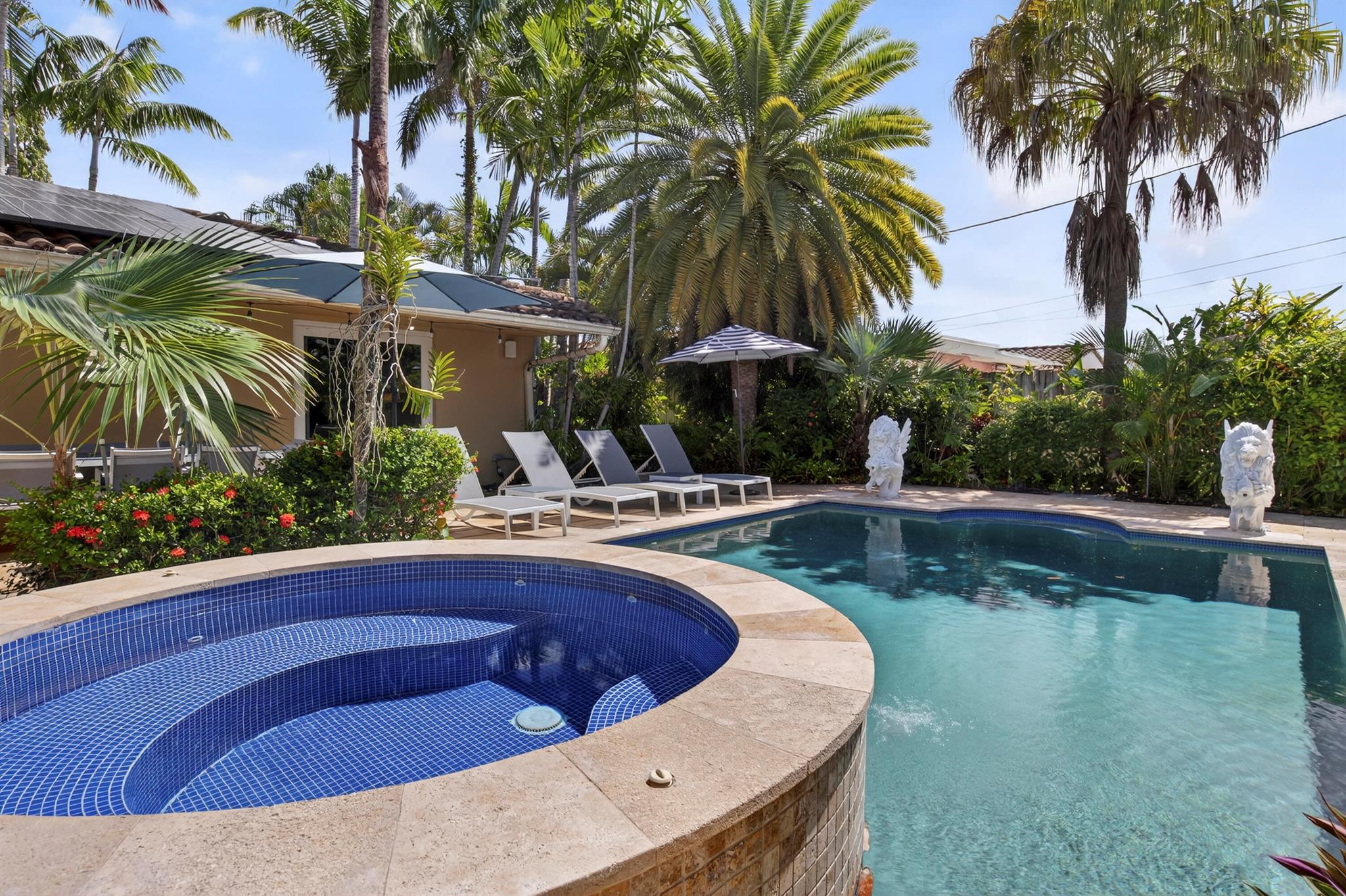 Discover this tropical paradise hidden gem in the heart of Fort Lauderdale. This stylish 4 bedroom, 2 bathroom furnished home features bright, open living spaces, gourmet chef's kitchen, built in closets, and modern finishes. Both bathrooms include walk-in, roll-in showers for comfort, accessibility and a touch of spa like luxury. Enjoy an expansive backyard oasis with sparkling, heated pool, hot tub and extensive outdoor seating, ideal for sun soaked afternoons, evening cocktails or dining under the stars. The front boasts a lush tropical patio with beautiful fountain, creating a serene welcome as well as a wonderful setting for morning coffee or peaceful relaxation. Located minutes from beaches, boating, dining and nightlife, this one captures the best of South Florida living.