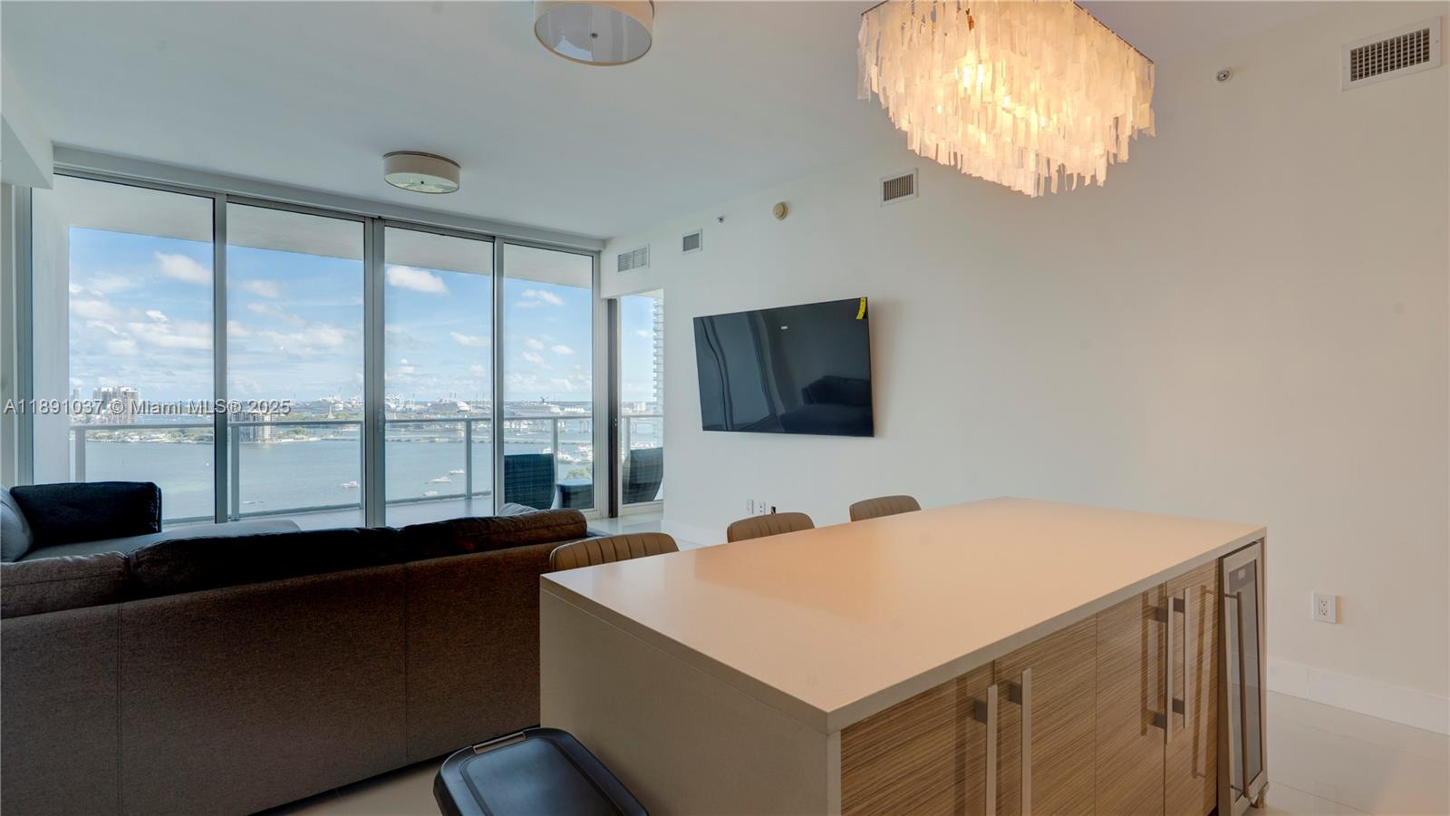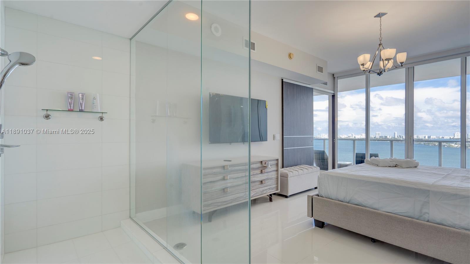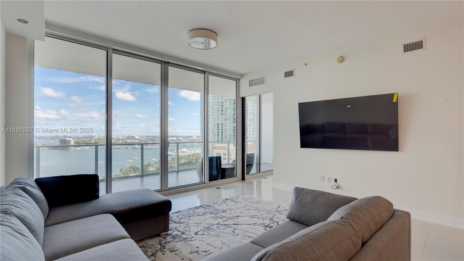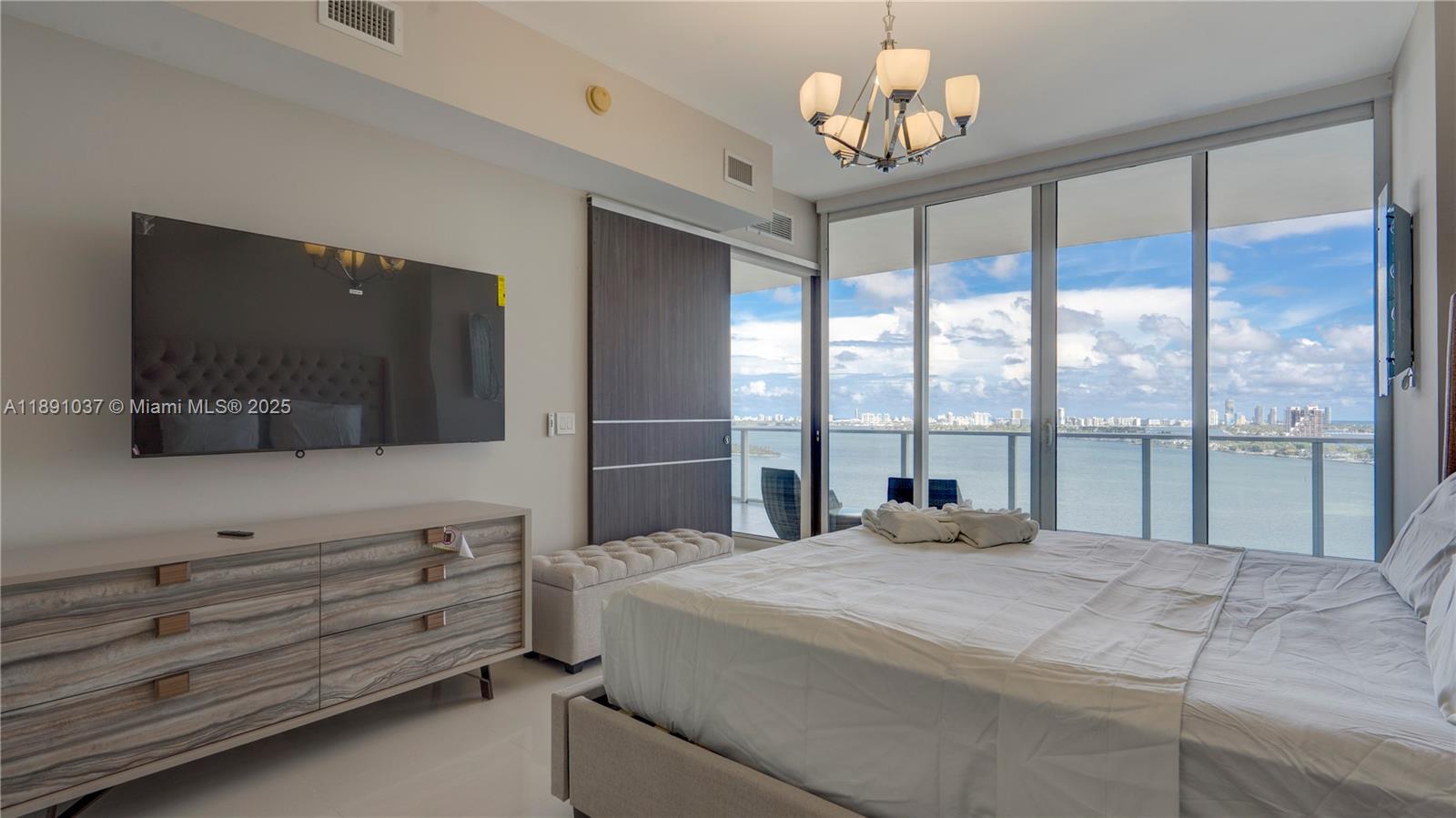 Available for short term rental. Experience luxurious waterfront living at Paramount Bay with panoramic water views. This direct-bay condo offers a private elevator, sleek 24x24 tiles, custom wooden doors, and a renovated kitchen and baths with California Closets. It comes partially furnished with new TVs and stylish furniture, and is available today for either short-term or long-term stays. Enjoy resort-style amenities: sunrise and sunset pools, deluxe club rooms, business center, and lounge with large TV and kitchen, plus more. Flexible layout can live as a one bedroom plus office/den or function as a true two bedroom. And the views... There's no better way to start your day with these views!