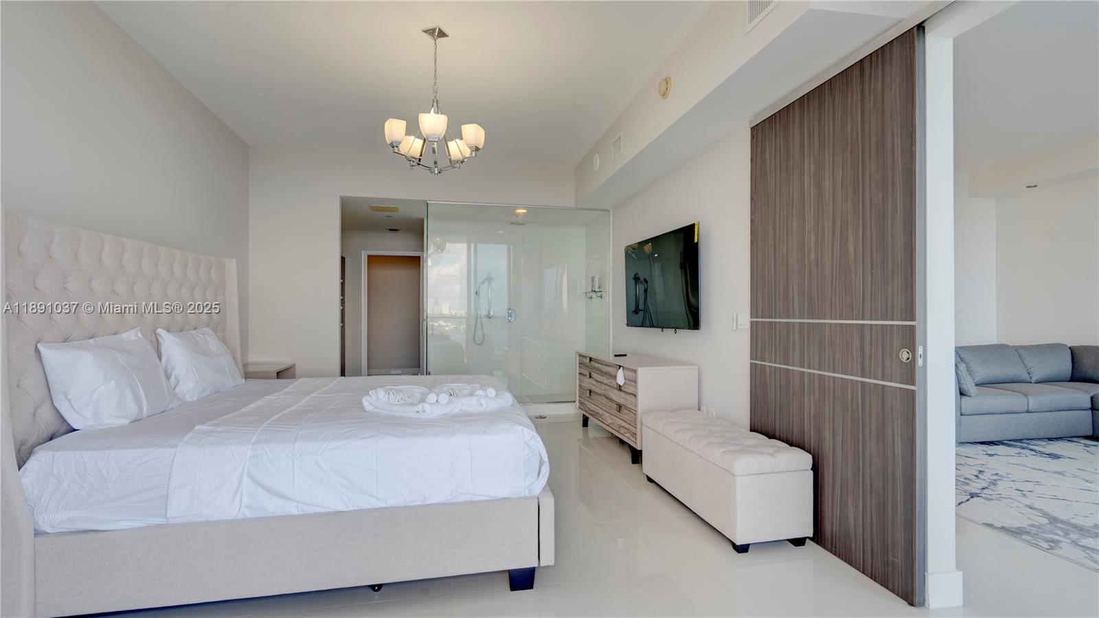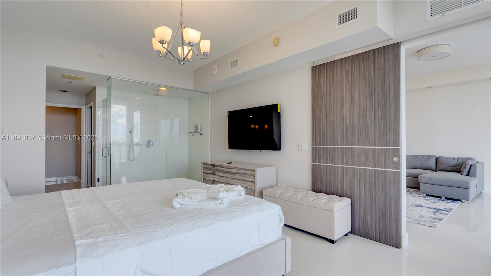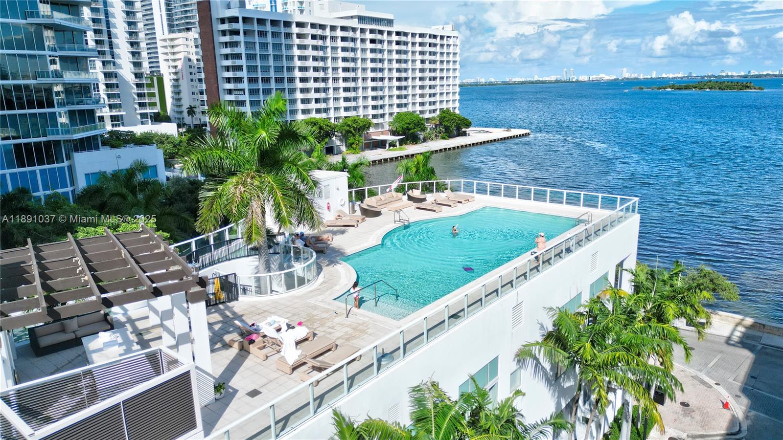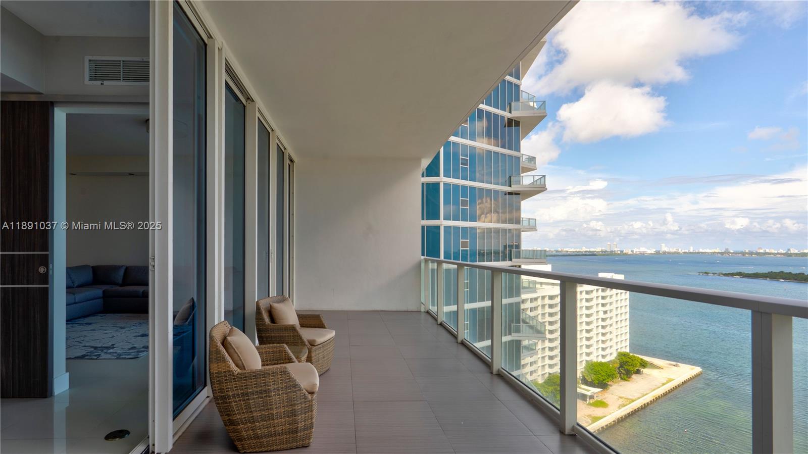 Available for short term rental. Experience luxurious waterfront living at Paramount Bay with panoramic water views. This direct-bay condo offers a private elevator, sleek 24x24 tiles, custom wooden doors, and a renovated kitchen and baths with California Closets. It comes partially furnished with new TVs and stylish furniture, and is available today for either short-term or long-term stays. Enjoy resort-style amenities: sunrise and sunset pools, deluxe club rooms, business center, and lounge with large TV and kitchen, plus more. Flexible layout can live as a one bedroom plus office/den or function as a true two bedroom. And the views... There's no better way to start your day with these views!