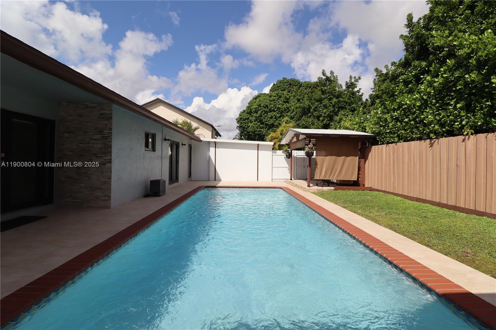 Welcome to this beautifully maintained home offering comfort, style and relaxation. Step outside to your private backyard oasis with an amazing pool, perfect for entertaining after a long day. The home also includes covered barbecue hut with grill, seating area, and half-bath. Spacious patio ideal for gatherings. Ample living room, open floor plan/high ceilings that create a bright and airy atmosphere. Featuring 2 bedrooms and 2 stylishly updated bathrooms. The kitchen includes brand-new stainless-steel appliances. Washer and Dryer included. Conveniently located near shopping, dining and major highways, this home offers the perfect blend of convenience and tranquility.