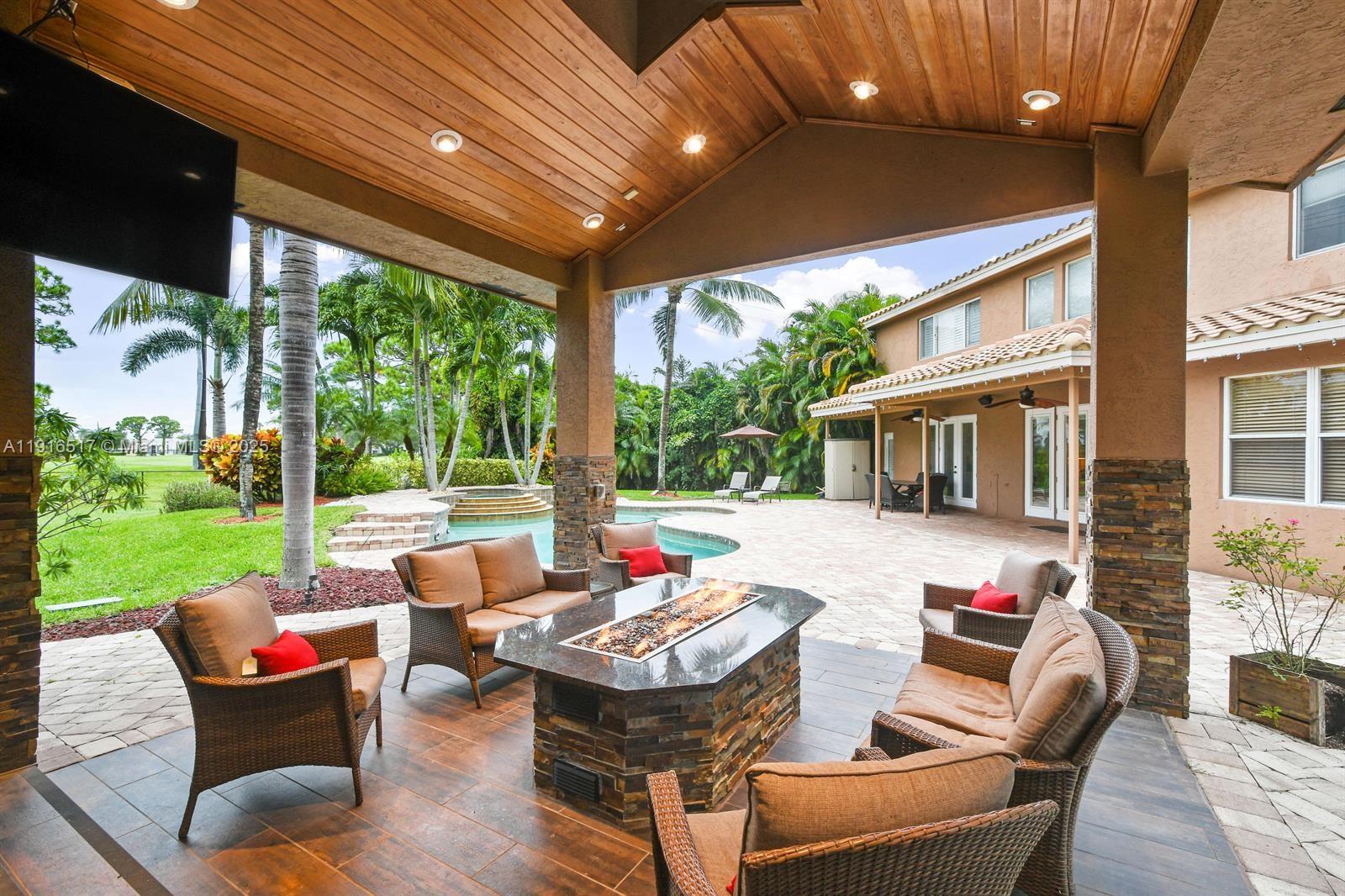Gorgeous home minutes away from Roger Dean Stadium, 5 bedrooms, 3 1/2 baths, 3 car garage and a spectacular backyard with an amazing pool, waterfall, hot tub and complete outdoor kitchen for great entertaining, triple grill, flat grill, paella grill, wood fire pizza oven and 2 fridges. You may host a fabulous wedding or family gathering at this beautiful home overlooking golf course. Master has a king size bed with a seating room. 2 other bedrooms upstairs each has queen size beds and large bedroom have 2 double beds, a seating area with a queen sofa bed. Downstairs bedroom has queen bed and its own bathroom. There is an office room overlooking pool, great room with fireplace and 2 dining areas. There are also a formal living room and additional refrigerator in garage. Exceptional location