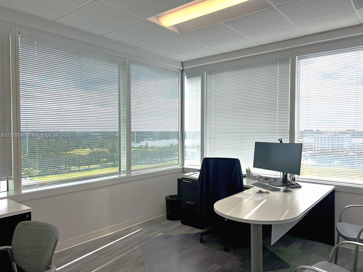 Corner office space available for lease featuring abundant natural light, stunning views of the lake and Miami International Airport, modern upgrades throughout, an open kitchen area, five glass-partitioned offices with a central cubicle zone, and negotiable furnishings. This plug-and-play space offers approximately 2,930 RSF, with a flexible asking rate of $35.00 PSF plus approx. NNN $15.83 PSF and lease term available through December 2027.