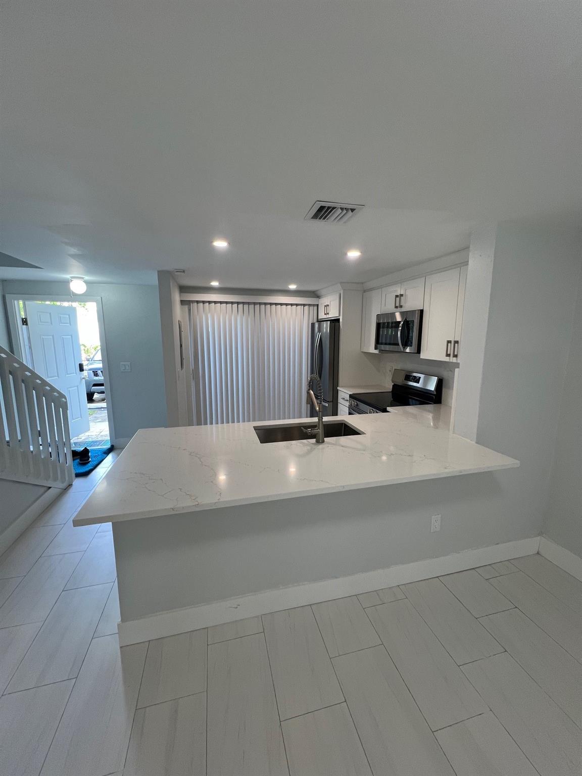 Completely renovated 2 Bed / 1.5 Bath Townhouse located in the heart of Pompano Beach. This stunning townhome features an open-concept kitchen with white shaker cabinets, quartz countertops with bar top seating, and brand-new stainless steel appliances. Wood plank tile flows throughout the main living area with a convenient half bath downstairs. Fenced in patio in the back to enjoy some fresh air and BBQ. Upstairs offers two spacious bedrooms, a beautifully updated bathroom with double vanities, and a walk-in closet. In-unit front loading washer and dryer. Unit has full impact windows. Pets allowed with landlord approval (max 2, $40/month per pet). No aggressive breeds please. Located close to Publix, Dining, Downtown Pompano Beach, Harrah's Casino, and the beach is only 3 miles away.