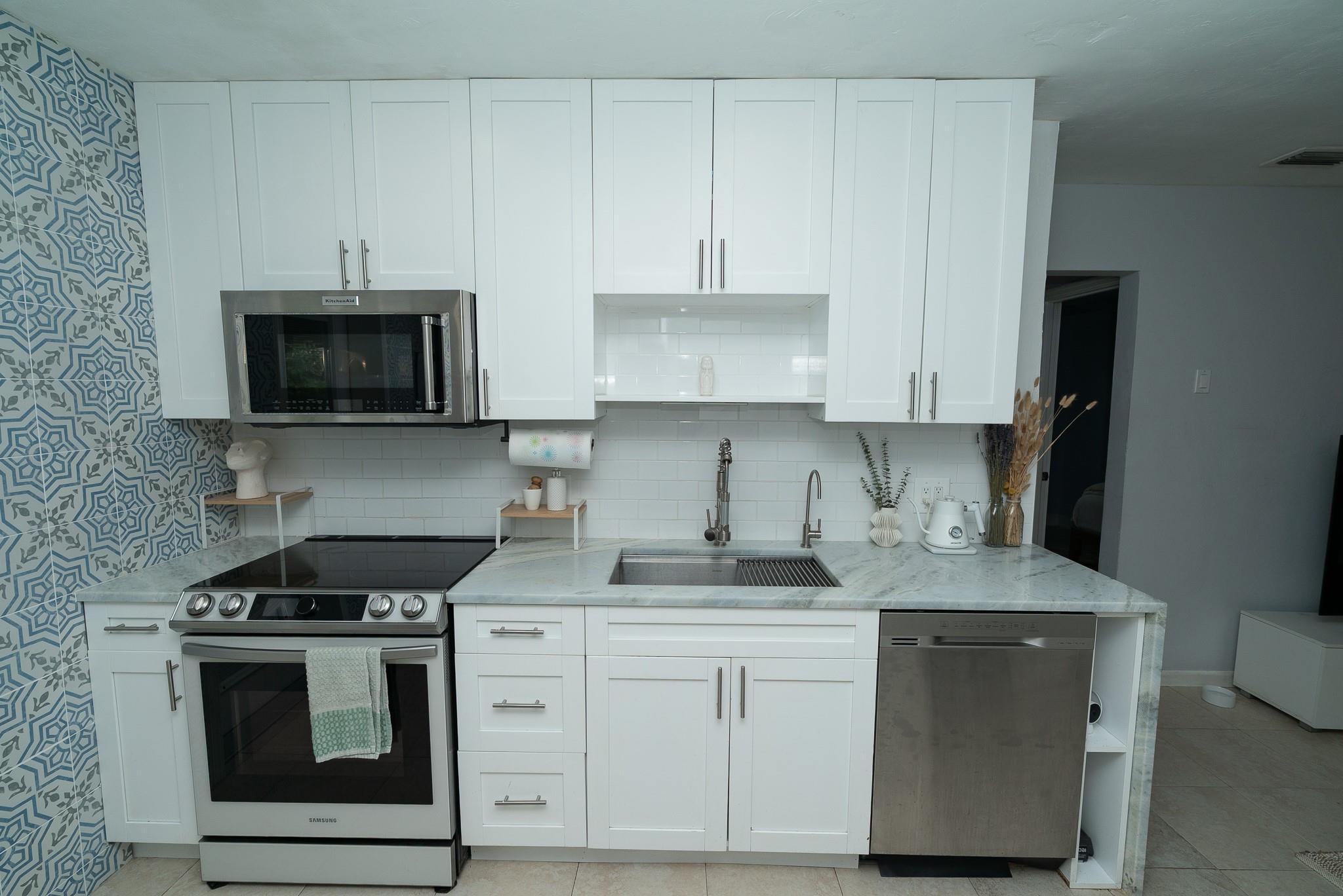 3-bedroom home full of character and charm in a lush tropical setting! Features a brand-new kitchen with stainless steel appliances, granite countertops, stackable washer/dryer, tile flooring and vinyl laminate flooring throughout. The spacious 3rd bedroom off the living room has its own private entrance and beautiful modern style bathroom—perfect for guests or separate living if desired. The screened front porch and beautifully landscaped, fenced backyard—designed with true Florida flair—offer inviting spaces to relax and unwind. Available furnished or unfurnished, with quick move-in possible. Pets welcome (breed sensitive). Lawn Maintenance included. 15 minutes to Ft Laud Beaches, Riverwalk, Las Olas Blvd and all the great restaurants and shopping!