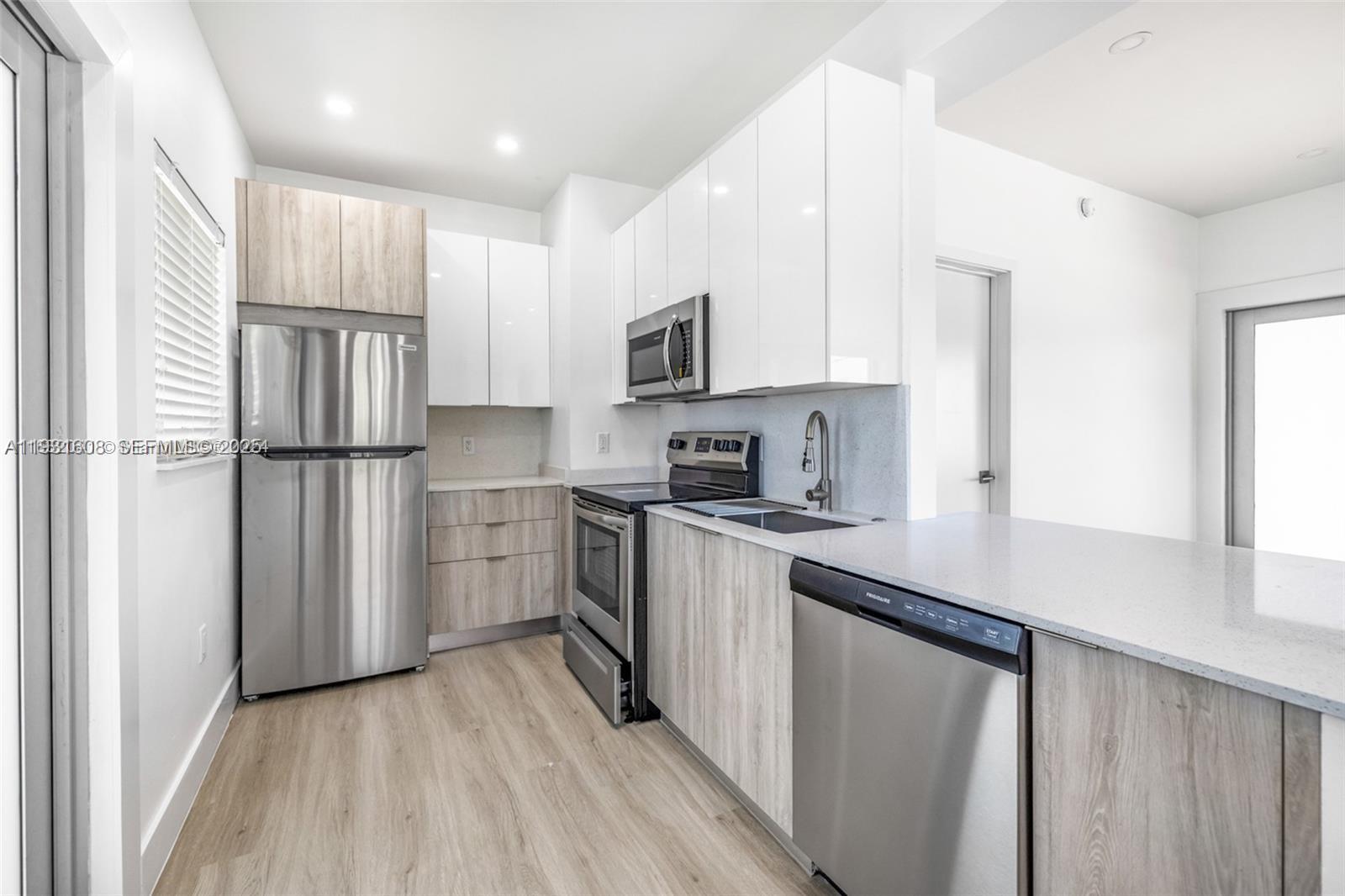 1 bedroom 1 bathroom unit available. brand new wooden laminate flooring featuring contemporary "Restoration Hardware" style and high-impact windows. Other features include recessed lighting, contemporary wooden baseboards, and solid wood doors with beautiful handles. The kitchen features Frigidaire appliances (including a dishwasher) and granite countertops with a full backsplash. Access code gated community. Laundry available on site. Pet-friendly community accepts pets over 25 lbs in weight. Privileged location across the Hallandale Police Department and YMCA. Plenty of street parking for guests. Tenant pays all utilities.