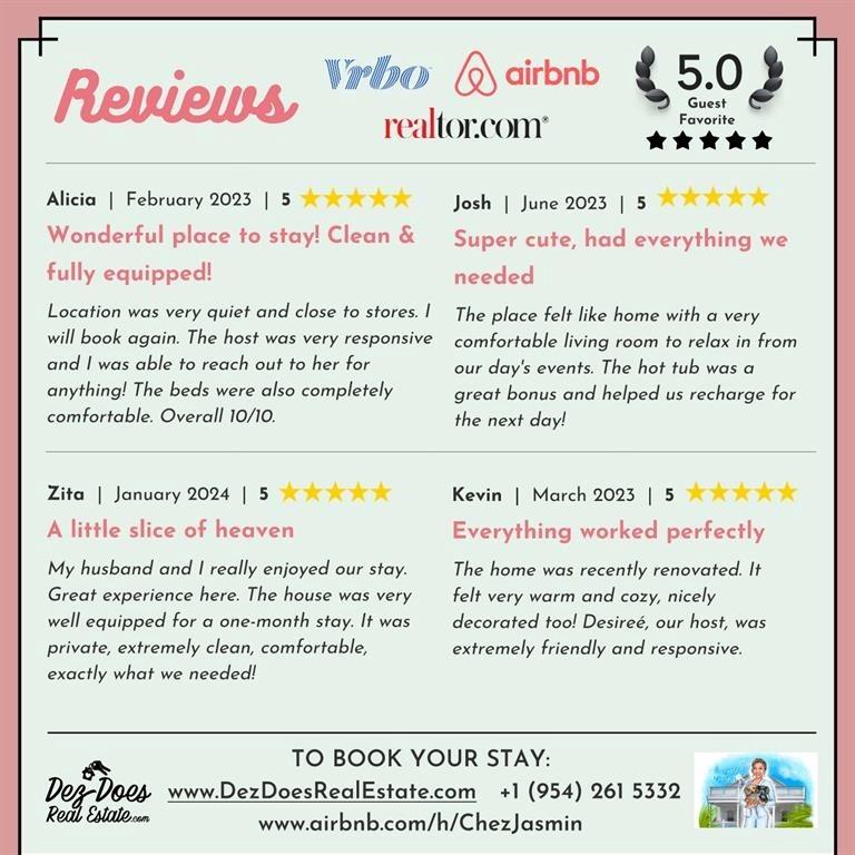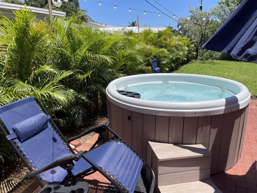 We invite you to discover our adorable house, a midcentury modern homestay perfect for beach lovers, boating enthusiasts and golfers! "Chez Jasmin" offers a retro vibe with all the comforts of a modern home, just 5 min from south Florida's most beautiful beaches! The house has two spacious bedrooms, a newly renovated bathroom, a large screened-in patio that doubles as a play room, & a modern well-equipped chef's kitchen. Enjoy our lush backyard with outdoor eating, BBQ, & 4-person hot tub! Our home is in a beautiful neighborhood just steps from the Intracoastal, boat launch, waterfront park, and marina. We are a short walk or drive from Pompano's beautiful golf course and olympic-sized aquatic center! Driving Directions: