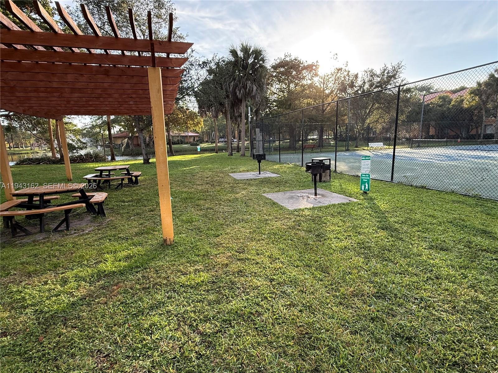 Bright ground-floor apartment with peaceful tennis court views. Features in-unit washer and dryer and an open, well-lit layout. New kitchen cabinets. Community offers resort-style amenities including pools, tennis courts, barbecue area, lake, fitness center, rentable clubhouse, and scenic walking paths surrounded by nature.
