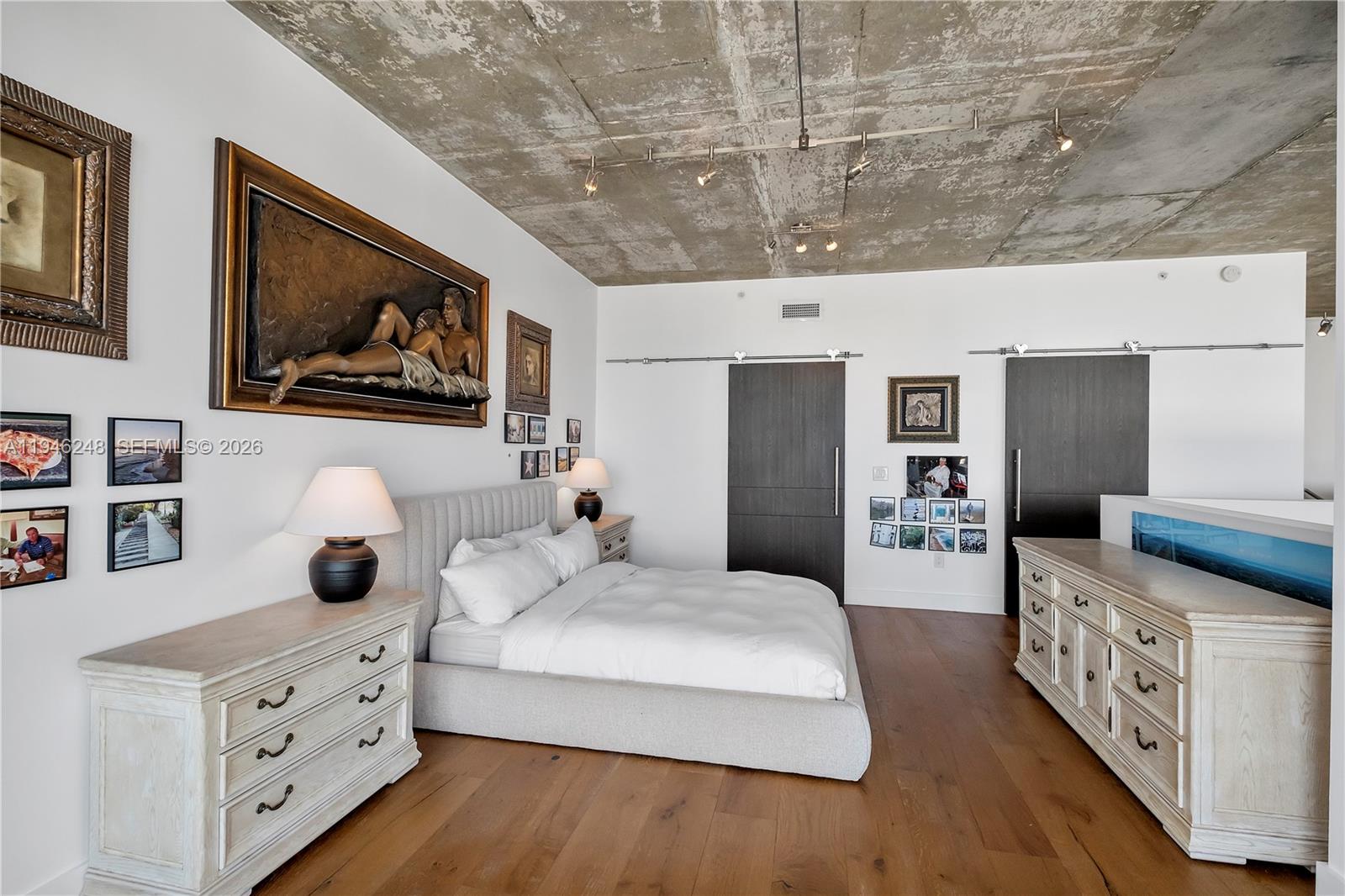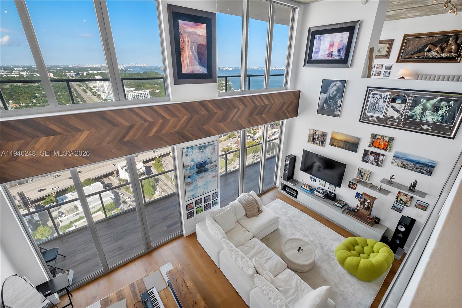 Exquisite two-story penthouse in the heart of Midtown Miami. This one-of-a-kind loft features 2 bedrooms, 2.5 bathrooms, and captivating north, west, and east exposures. Multiple terraces, including an expansive wraparound upper terrace, offer panoramic city, bay, and skyline views that capture both sunrise and sunset. Soaring 20-foot floor-to-ceiling windows flood the home with natural light, while double-height walls create a gallery-style backdrop ideal for large-scale art or statement lighting. Thoughtfully renovated with a custom Ornare kitchen, marble countertops, Armadi closets, Mia Cucina bathrooms, and European oak hardwood floors. Offered fully furnished and move-in ready, includes two parking spaces and prime access to the Design District, Wynwood, and Biscayne Bay