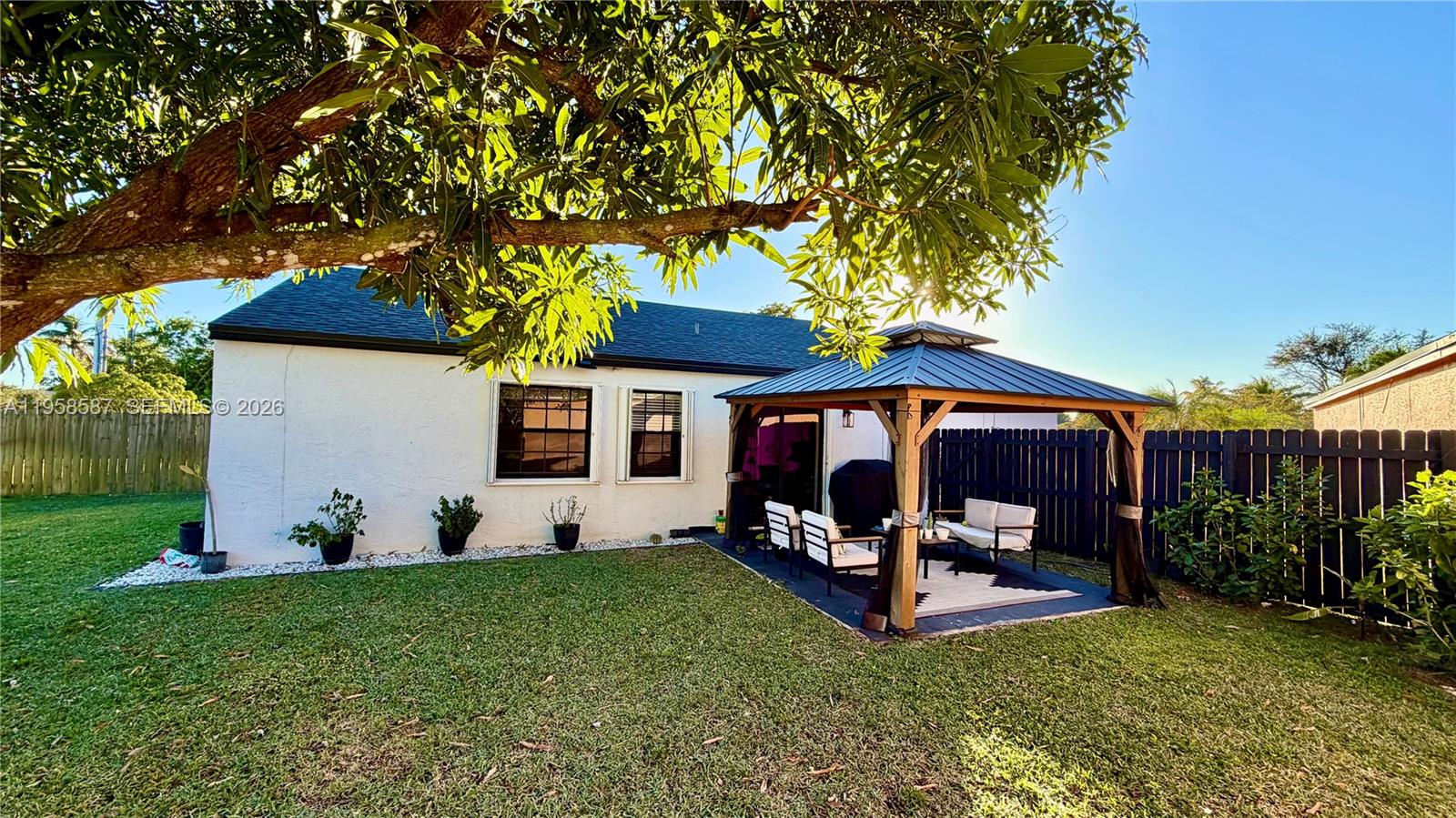 Beautifully updated and spacious 2-bedroom, 2-bath single-family home for rent in Miramar. This move-in-ready home features an open floor plan with vaulted ceilings, creating a bright and airy living space. The modern kitchen is equipped with stainless steel appliances, ample cabinet space, and flows seamlessly into the main living areas—perfect for everyday living and entertaining. Enjoy outdoor living in the large fenced backyard, complete with a gazebo, fruit trees, and plenty of space to relax or host guests. Additional features include washer and dryer in the garage, and two driveway parking spaces. Located in a desirable Miramar neighborhood with convenient access to shopping, dining, schools, parks, major highways, and public transportation. No pets allowed. This Miramar rental home offers privacy, comfort, and modern updates in a prime location—schedule your showing today.
