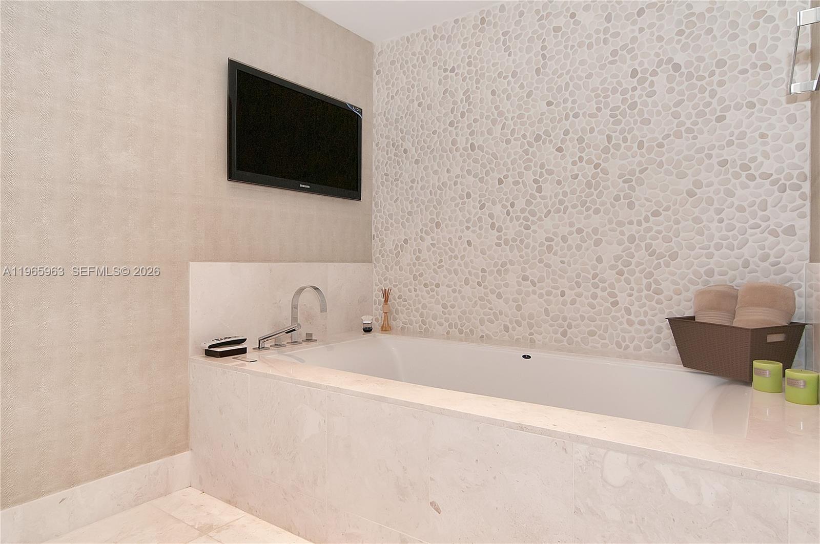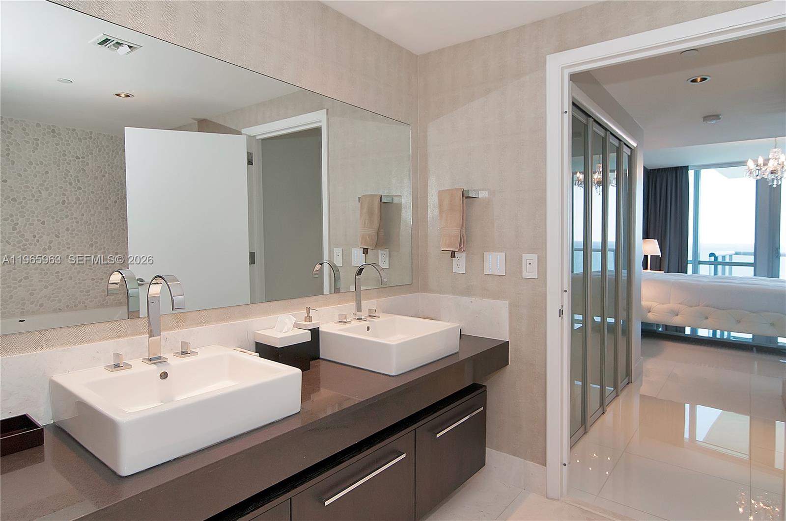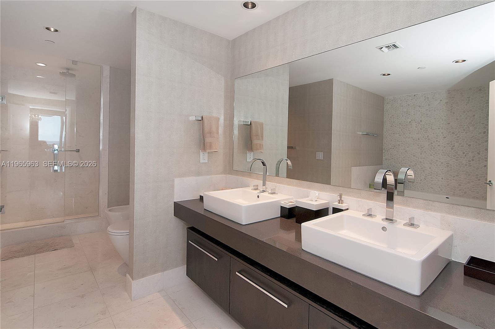 Exceptional opportunity to own a beautifully finished 1 Bed + Den / 2 Bath residence at Jade Ocean in Sunny Isles Beach. This elegant unit features striking white glass floors throughout (marble in bathrooms), creating a sleek, modern aesthetic with refined coastal flair. The open European kitchen showcases exclusive imported Snaidero white cabinetry with black granite countertops and premium Sub-Zero and Miele appliances. Thoughtfully upgraded with motorized shades in the living area, manual blackout shades in the bedroom, and custom built-in closets, the residence offers both comfort and sophistication. The versatile den is ideal for a home office or guest space. Jade Ocean offers world-class, resort-style amenities including a business center, game room, children’s playroom, party room, residents’ lounge, and commercial kitchen facilities. Enjoy two heated pools (east & west exposure), two Jacuzzis, a full-service spa with treatment rooms, and a state-of-the-art fitness center featuring advanced technology and Peloton equipment. Additional highlights include a private theater with golf simulator, private elevators, and 24-hour valet and front desk service. Luxury oceanfront living at its finest in the heart of Sunny Isles Beach.