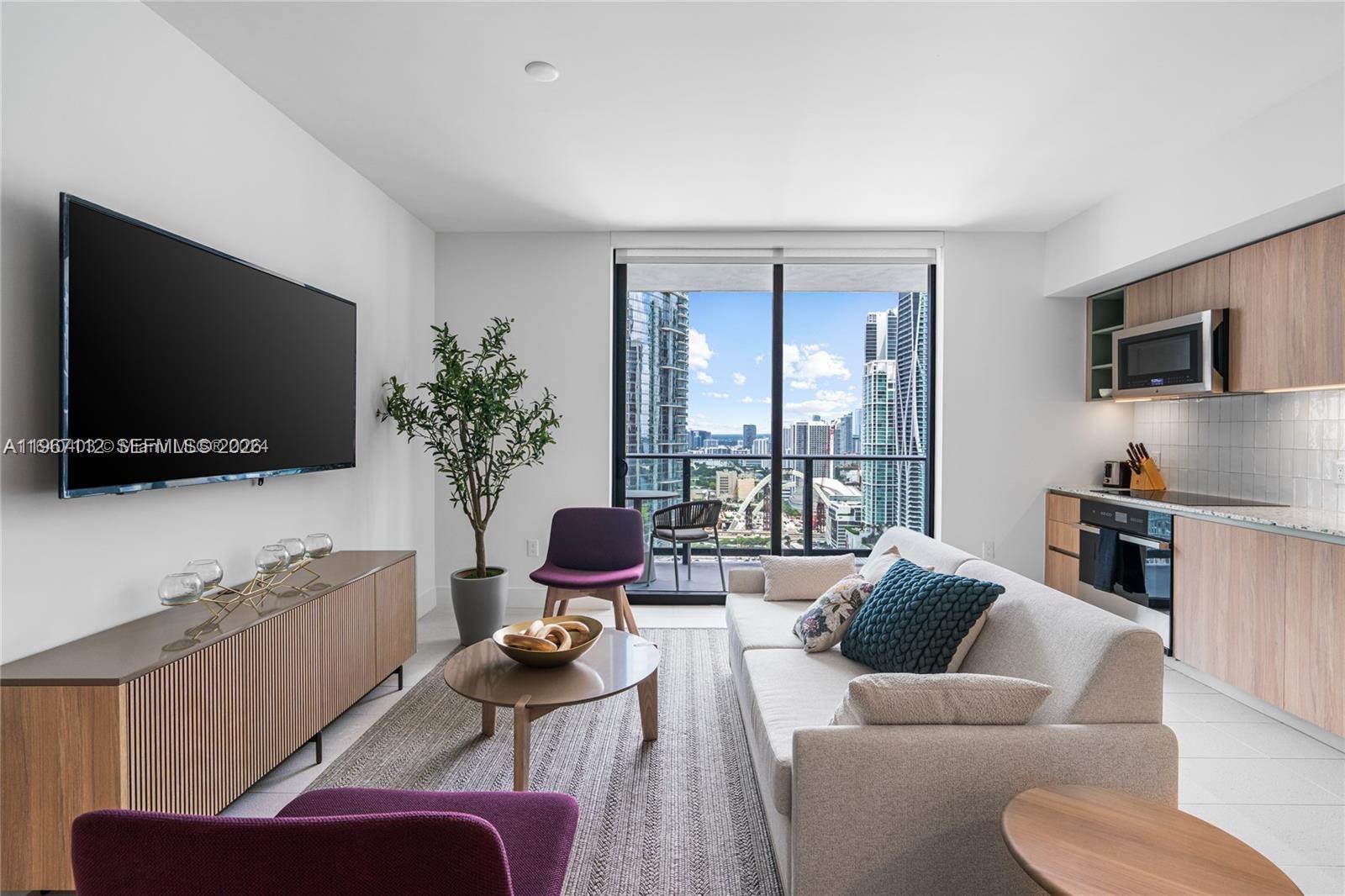 Natiivo/Gale Residences presents a brand new, spectacular 2-bedroom unit featuring a north-facing balcony. This fully furnished residence boasts an equipped kitchen and a TV in every room, designed with elegant West Elm furnishings. Amenities include a swimming pool with a bar overlooking Biscayne Bay, a steak restaurant, a speakeasy bar, a hammam, spa/sauna facilities, steam treatment rooms, a business center, a party room, and a gym with stunning views of Biscayne Bay. Enjoy 24-hour concierge and valet parking services. Conveniently located just one block from Bayside and the Miami World Center, you'll find shopping and dining options nearby. The Brightline train station, connecting to Orlando, is only a few blocks away. One Valet Parking included.