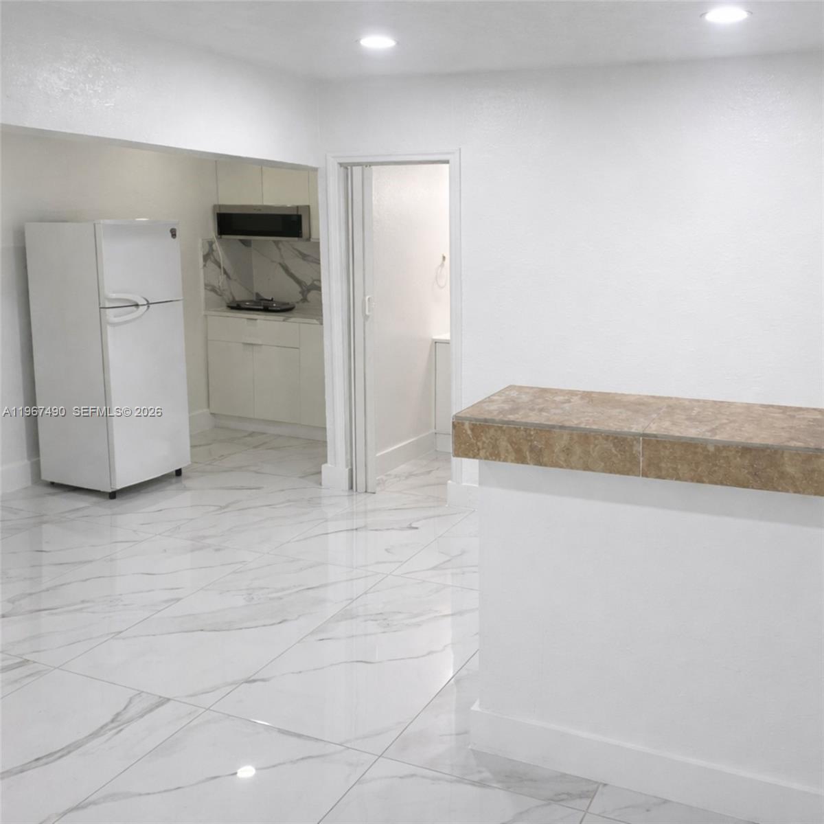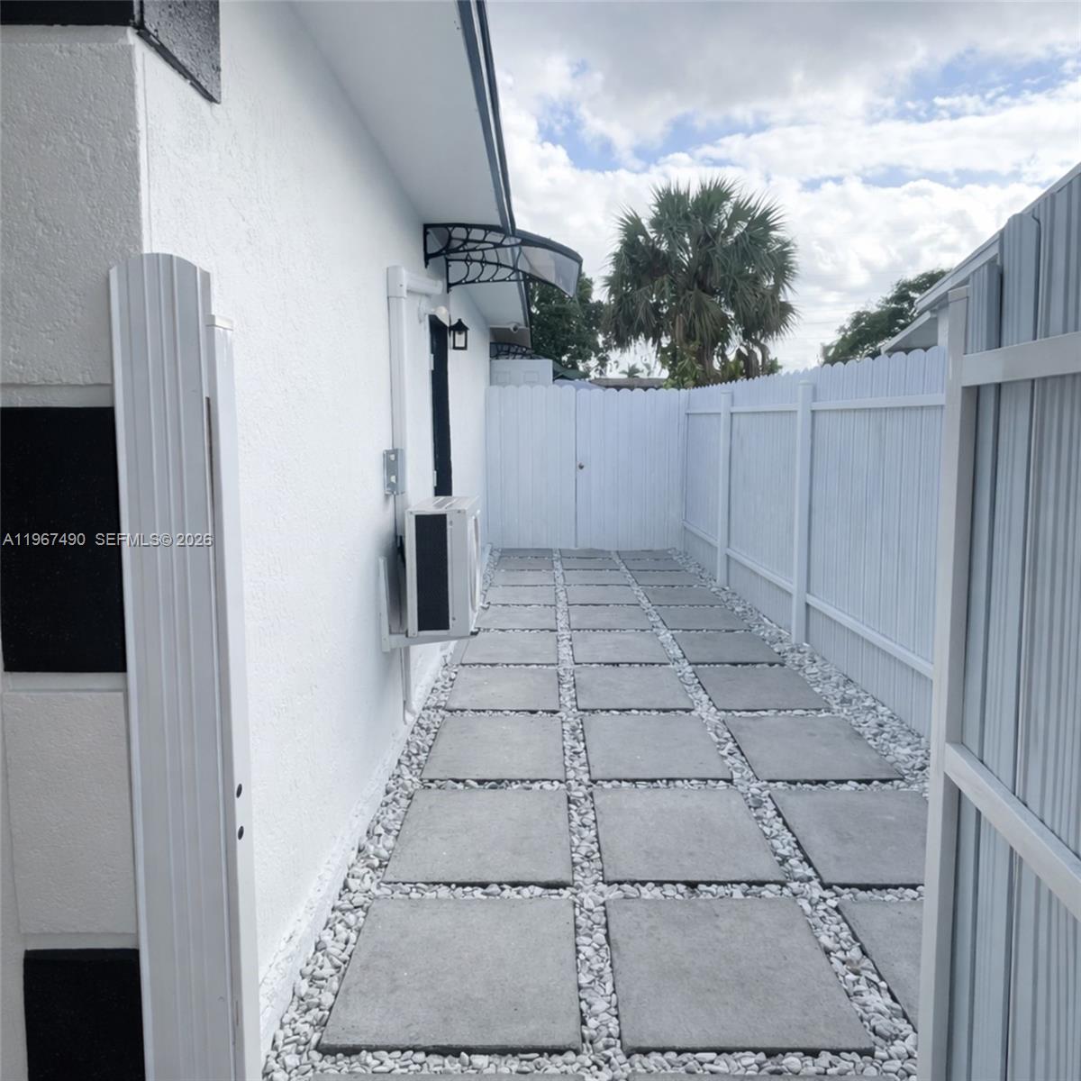 Recently remodeled open-concept efficiency, approximately 600 square feet, offering a functional and comfortable layout. Features a full bathroom, private side entrance, and a long closet with accordion doors. A mini counter separates the sleeping area from the dining space, providing defined areas within the open layout. The unit is unfurnished and includes refrigerator, microwave, portable double electric cooktop, and mini-split A/C. One (1) parking space available parallel to the curb in front of the property. Enjoy a fenced outdoor area next to the unit with concrete pavers and white stone accents, ideal for outdoor use. No pets allowed. Move-in requires first month and one month security deposit. Water, electricity, internet, and trash are included. Please note: there is another independent rental unit located on the same side of the house. Both rentals share the same exterior access area, while each unit remains separate.