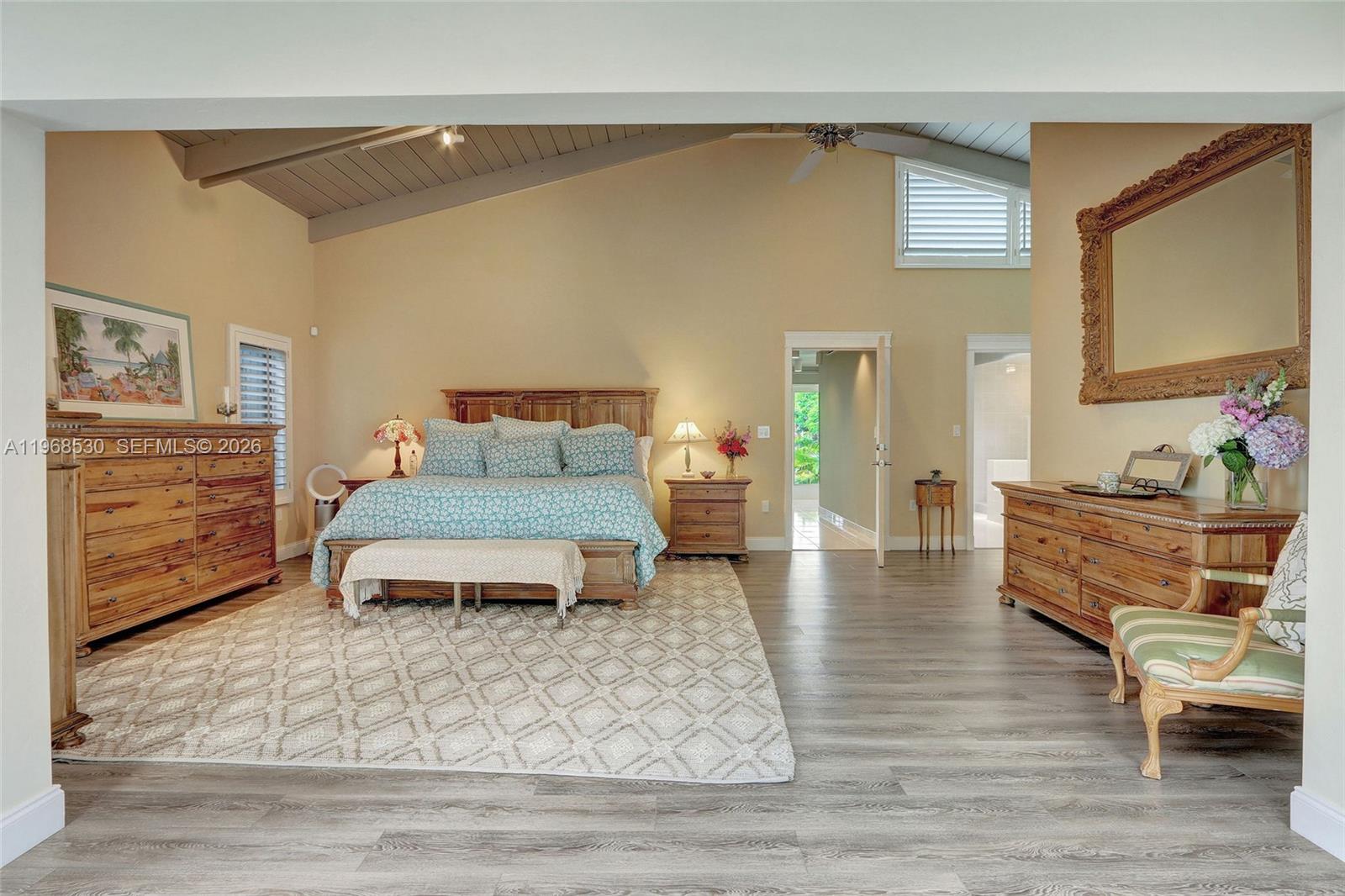 Sprawling 5 bedroom, 4 bath home is nestled on an acre of gracious oaks and lush greenery. Meandering pathways lead to quiet spots for relaxation and nature watching. Unique home has oversized windows showcasing serene views. Wood vaulted ceiling accents main living. Expansive primary suite features spacious sitting area with skylights and plantation shutters overlooking lush gardens. Gather with friends in the large entertainment room with mahogany pub-style bar. Home boasts office space, fireplace, and generously sized rooms. Kitchen features Corian counters, sleek Italian cabinetry, and built in Sub Zero.