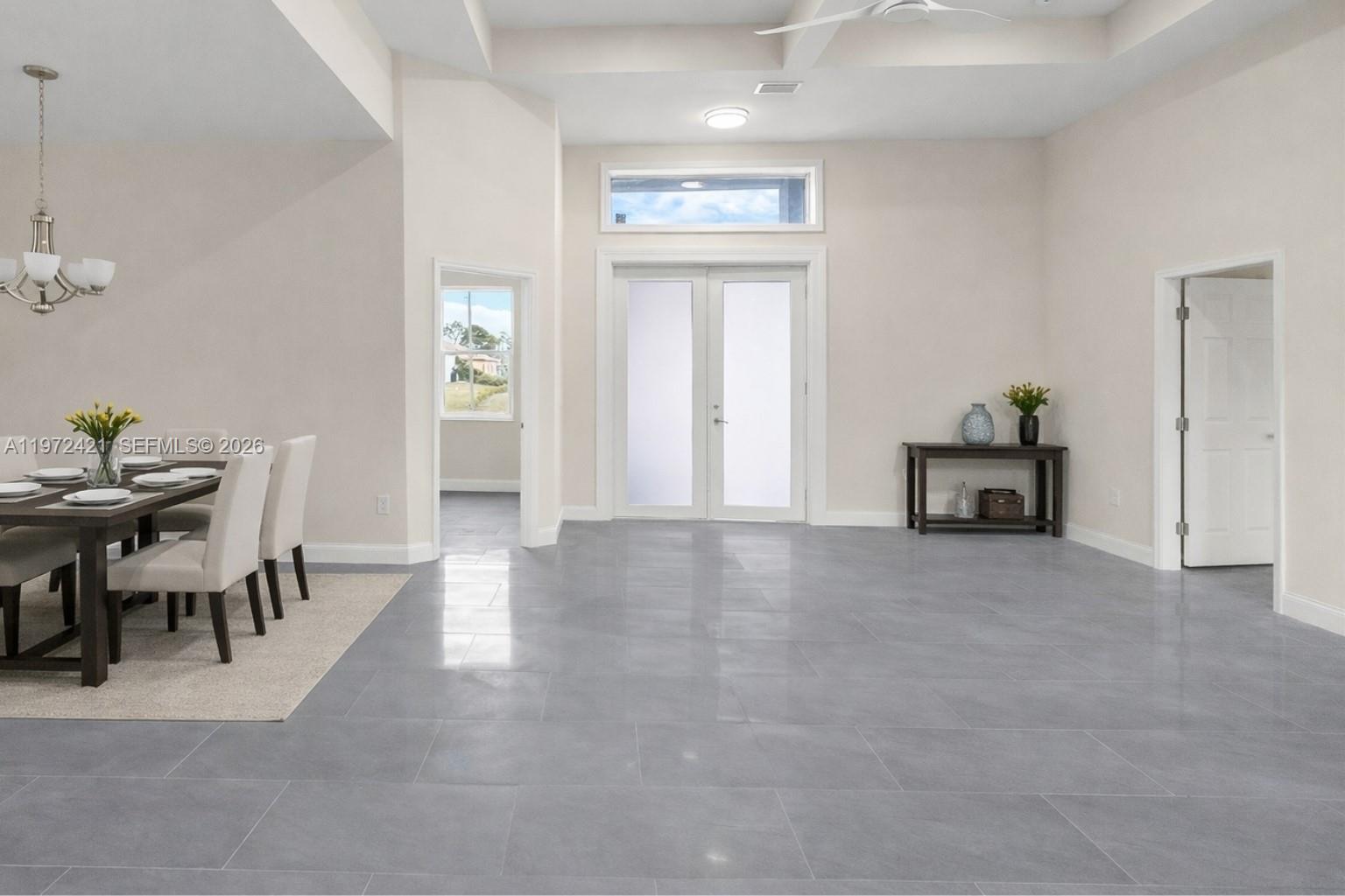 Welcome to this brand-new 2024 construction home located in the heart of Lehigh Acres, now available for rent. This stunning 3 bedroom + den, 2 bath residence features a modern open floor plan with elegant gray tile flooring throughout and tray ceilings that enhance the bright, airy feel of the home. The spacious great room flows seamlessly into the beautifully designed kitchen, complete with soft-close cabinets, granite countertops, stainless steel appliances, decorative backsplash, and an oversized island, ideal for entertaining or everyday living. The home offers two master suites, each with walk-in closets, dual sinks, and walk-in showers, providing privacy and flexibility for families or shared living. Large windows and recessed lighting fill the space with natural light, while the open lanai overlooks a peaceful freshwater canal, creating the perfect outdoor retreat. Built with solid concrete block construction, this property includes an attached 2-car garage, well and septic system, and sits on a generous lot with room to enjoy outdoor living. Located in a quiet area yet conveniently close to shopping, schools, and major roadways, this move-in-ready rental offers the perfect blend of modern style, comfort, and space.