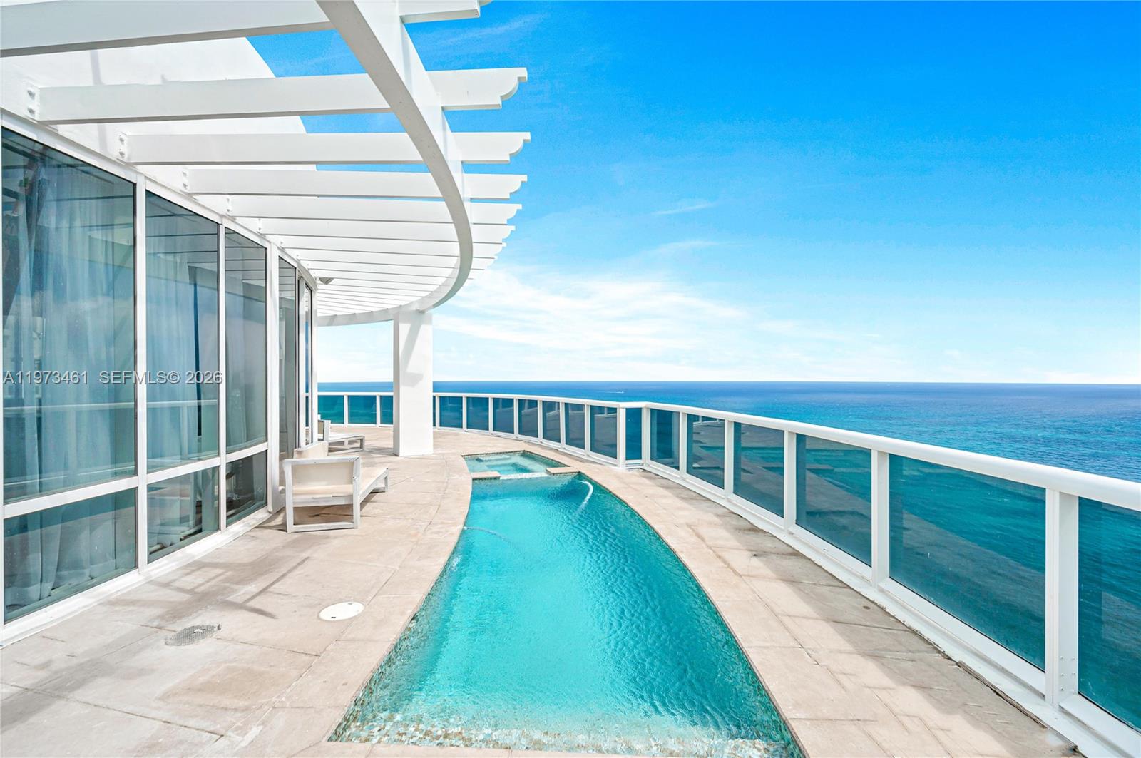 Exceptionally rare — very few residences in Sunny Isles Beach offer what this one does. Penthouse 5509 at Trump Palace is a two-story direct oceanfront duplex spanning over 4,100 square feet with soaring 21-foot ceilings that feel more like a private estate than a condominium. Four bedrooms, 4.5 baths, two full living rooms, and two kitchens — the main upstairs facing the full sweep of the Atlantic, looking north and south along the coastline and wrapping west for breathtaking sunsets over the Intracoastal. Panoramic views from every angle. A dramatic glass staircase connects the levels, setting the tone for a residence as architectural as it is livable. Integrated sound, electric shades, and climate control throughout. The crown jewel: a private 2,000-square-foot rooftop terrace with your own pool and jacuzzi — no shared deck, no neighbors, just open sky, open water, and a sunset that will reset your perspective on what luxury feels like. At beach level, a rare private air-conditioned beachside cabana with full bathroom steps from the sand — very few units in the building offer this. Full Trump Palace amenities: 1,000 feet of beachfront, lagoon and lap pools, 8,000-square-foot spa, fitness center, tennis, and dining. Direct Trump International Hotel access: preferred guest rates, dining discounts, complimentary valet. Fully furnished.