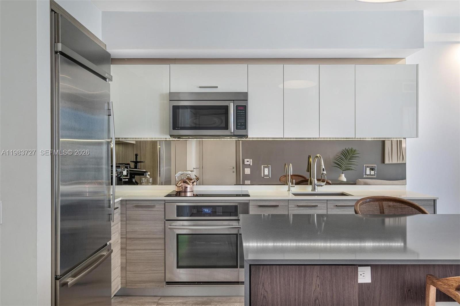 this upgraded residence features floor-to-ceiling windows and a wide wraparound balcony with views of Brickell Bay Drive and Biscayne Bay. The modern kitchen includes a custom island with integrated drawers and an extended counter for seating, a bronze mirrored backsplash, and a water filtration system. The living area is enhanced with recessed ceiling lighting, while motorized blinds and shades are installed throughout the apartment. The spacious primary bedroom features a large custom cherry-wood closet, offering generous storage. A stylish and comfortable home in the heart of Brickell with thoughtful upgrades and beautiful bay views.