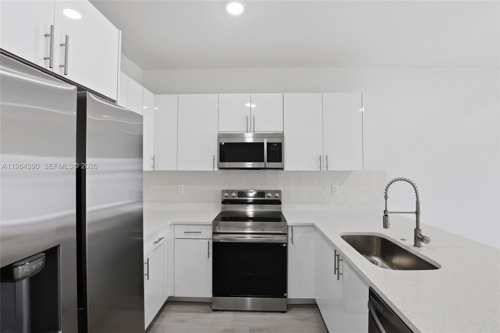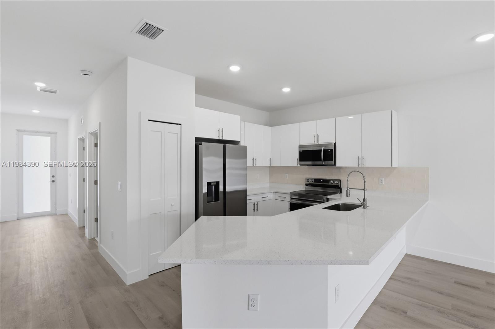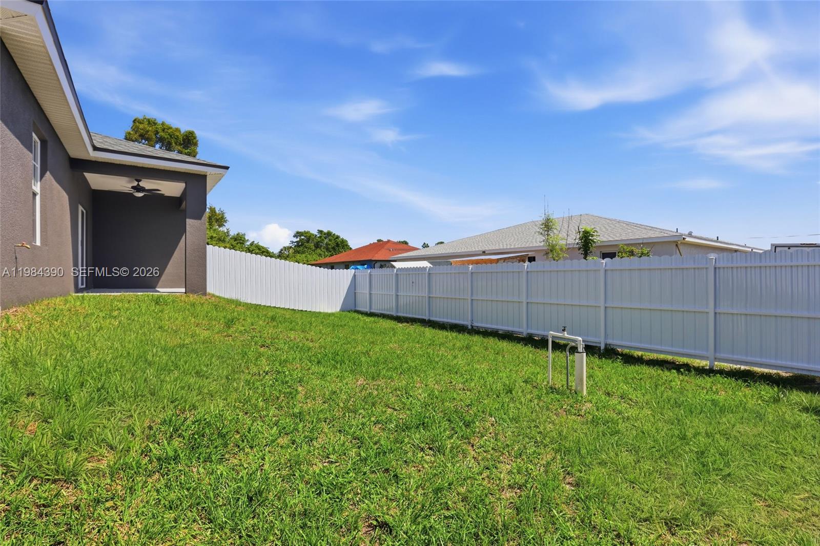 Be the first to live in this stunning brand new 3 bedroom, 2 bath fenced backyard with a divider between both units, providing each residence with its own private outdoor space. Covered lanai, a 1 car garage with additional parking space in the long driveway that can fit two additional cars, designed with modern finishes and comfortable living in mind. This never lived in residence features a bright open concept layout with stylish luxury vinyl flooring, recessed lighting, and large windows that fill the space with natural light. The beautiful kitchen is the heart of the home, showcasing sleek quartz countertops, modern cabinetry, stainless steel appliances, and a spacious breakfast bar perfect for casual dining or entertaining guests. The spacious bedrooms offer ample closet space, while the bathrooms feature elegant vanities and beautifully tiled walk in showers, creating a clean and contemporary feel throughout the home. Enjoy the convenience of central A/C, in unit washer and dryer, and a covered lanai with ceiling fan and lighting, ideal for relaxing outdoors. The property also offers generous backyard space for added comfort and privacy. A perfect combination of modern design, comfort, and brand new construction. Move in ready and waiting for its very first residents.