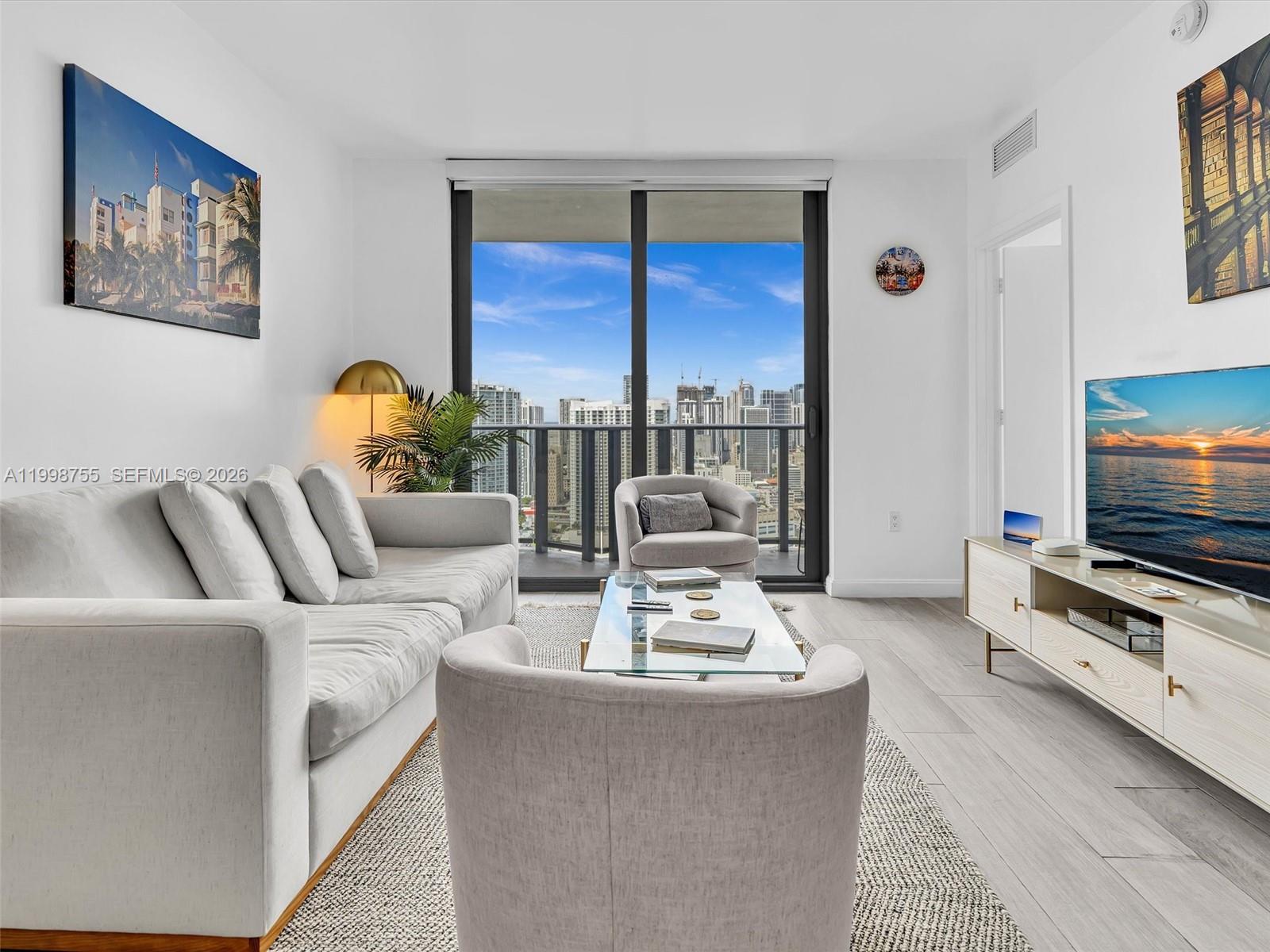 Turnkey designer 1-bedroom, 2-bathroom residence in the heart of Brickell, just steps from Brickell City Centre. This beautifully furnished & tastefully updated corner unit offers a clean, modern aesthetic w/ high-end finishes throughout. The open-concept layout is filled w/ natural light, featuring sleek flooring, a contemporary kitchen w/ premium appliances & thoughtfully curated designer furnishings that make this home truly move-in ready. The spacious living area flows seamlessly onto an oversized private balcony with stunning panoramic views of the Brickell skyline and the Miami River below—an ideal setting to enjoy both sunrise and evening city lights. The well-designed floor plan offers a generously sized bedroom, ample closet space, and an additional guest bathroom. The layout also provides flexibility for a home office. Additional features include in-unit laundry and one valet parking space included. Brickell Heights offers an exceptional lifestyle with resort-style amenities, 2 stunning pools-one of which is a rooftop pool with panormaic views, state-of-the-art fitness center, spa w/ steam room and sauna, jacuzzi, beautifully designed resident lounge areas, 24-hour concierge, valet & more. Located in the center of it all, just steps from Brickell City Centre’s world-class shopping, dining, cafes, and vibrant nightlife—offering the ultimate walkable lifestyle in one of Miami’s most sought-after neighborhoods. Video available upon request, schedule your showing today.